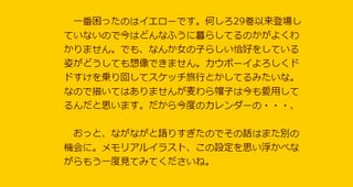 Yellow was the hardest to figure out. After all, she hasn't appeared since volume 29, so it's unclear how she's living now. But I just can't picture her looking girly. More like riding around on Dody cowboy-style, sketching on trips or something. So I didn't draw it, but I bet she still loves her straw hat. That's why this calendar's…