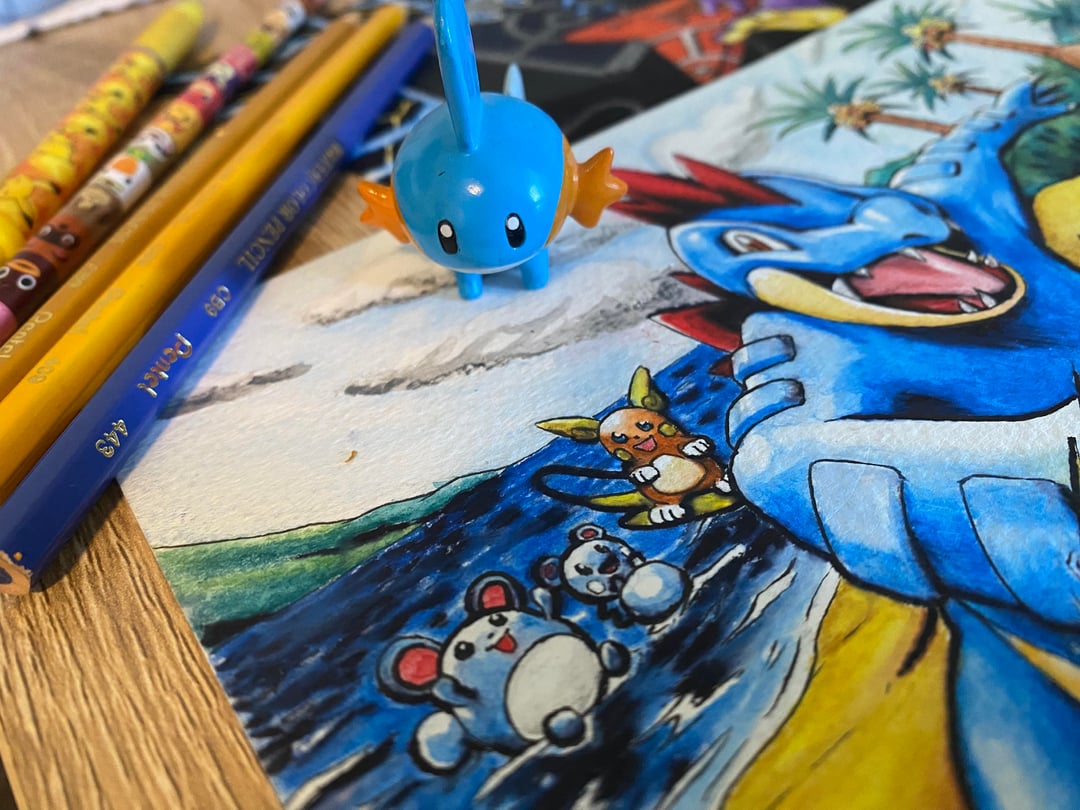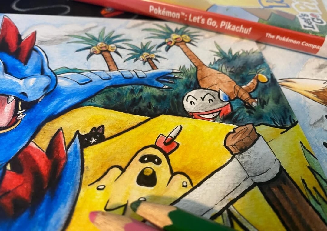 [OC] Feraligatr, Toxtricity, & Eevee (watercolour pencil)
