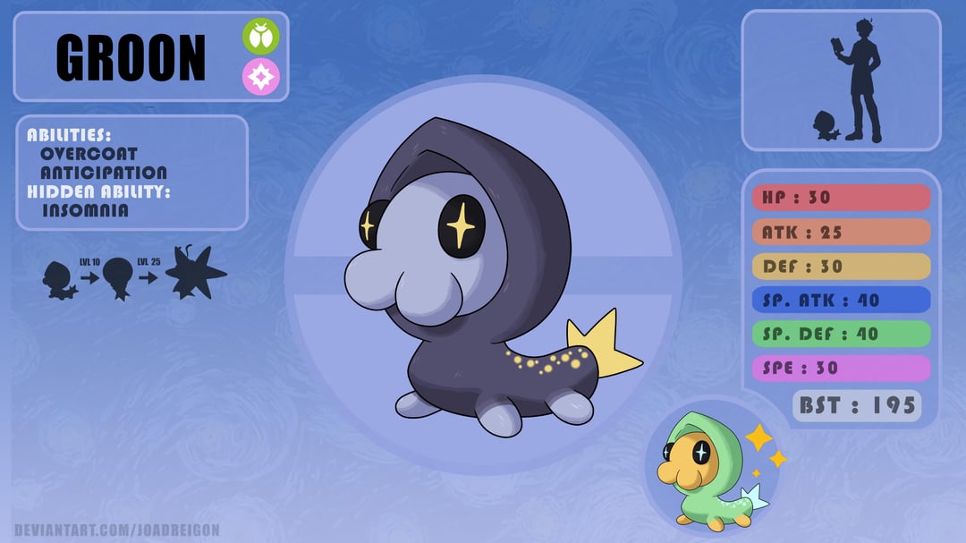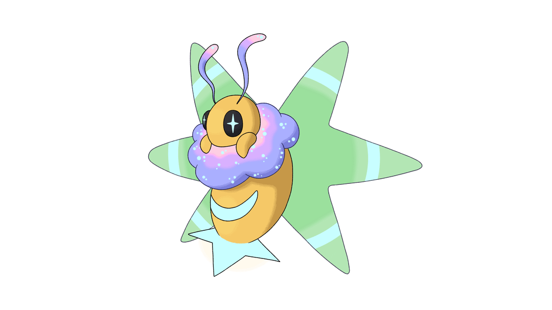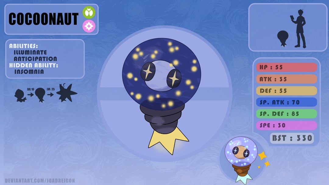 I played a little with the light obsessed moths theme, just in this case it is moonlight in particular they are obsessed with. Groon is like a novice cultist (the larvae of the moth has a little hood), Cocoonaut is built like a lightbulb but his head floats in there to be able to look at the night sky from every angle, he absorbs moonlight and doesnt eat or drink. And Lunith is the final conclusion of all that moon worshipping, having a moon pattern in its wings and fur ressembling a galaxy in its neck, it looks like a god to little groons.