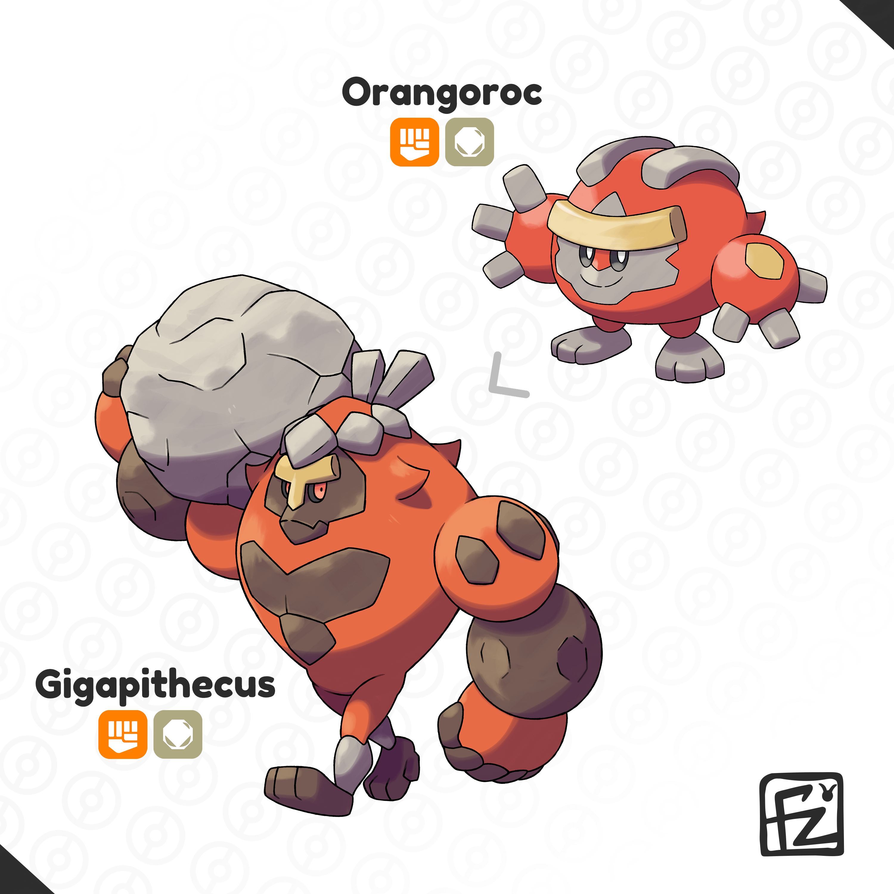 Orangoroc works stone with tireless dedication. When exposed to a special item, its dormant prehistoric genes awaken, evolving it into Gigapithecus.