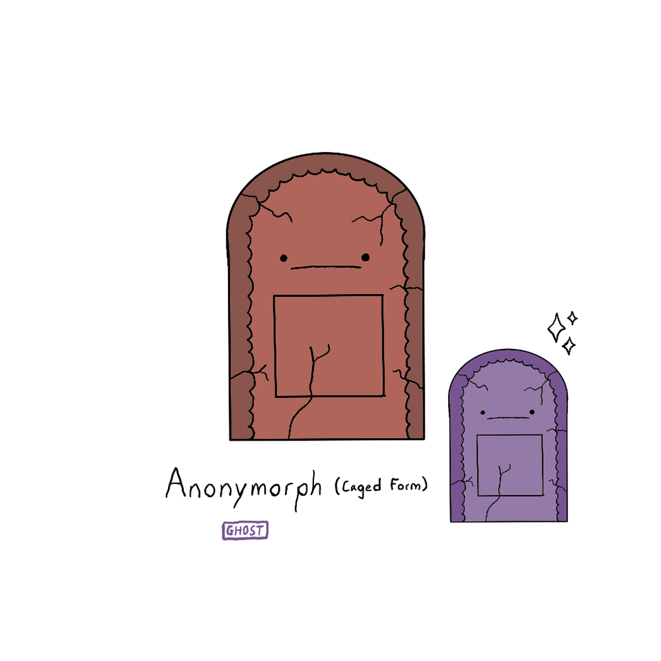 Anonymorph is a bundle of souls bound together by ignorance and hatred. When damaged enough in battle, these ignored souls break out of Anonymorph's tombstone to haunt everyone around it, seeking revenge for the hatred they received.