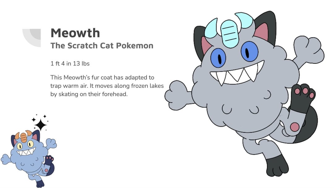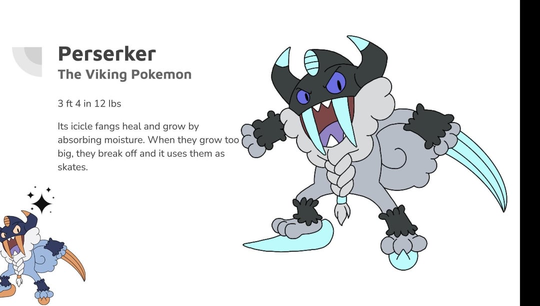 Type: Ice Ability: Pick Up, Fur Coat, Rattled(Hidden) HP 50 Atk 40 Def 65 SpA 35 SpD 30 Spe 70 Total 290 Type: Ice Ability: Slush Rush, Tough Claws, Ice body(Hidden) HP 65 Atk 115 Def 90 SpA 40 SpD 60 Spe 70 Total 440 by WHbros4eva 2 Comments BroadNerve279 4 months ago Tell me this is a redesign of galar meowth Famous-Register-2814 4 months ago This is so much better than real Perserker Write A CommentYou must be logged in to post a comment.