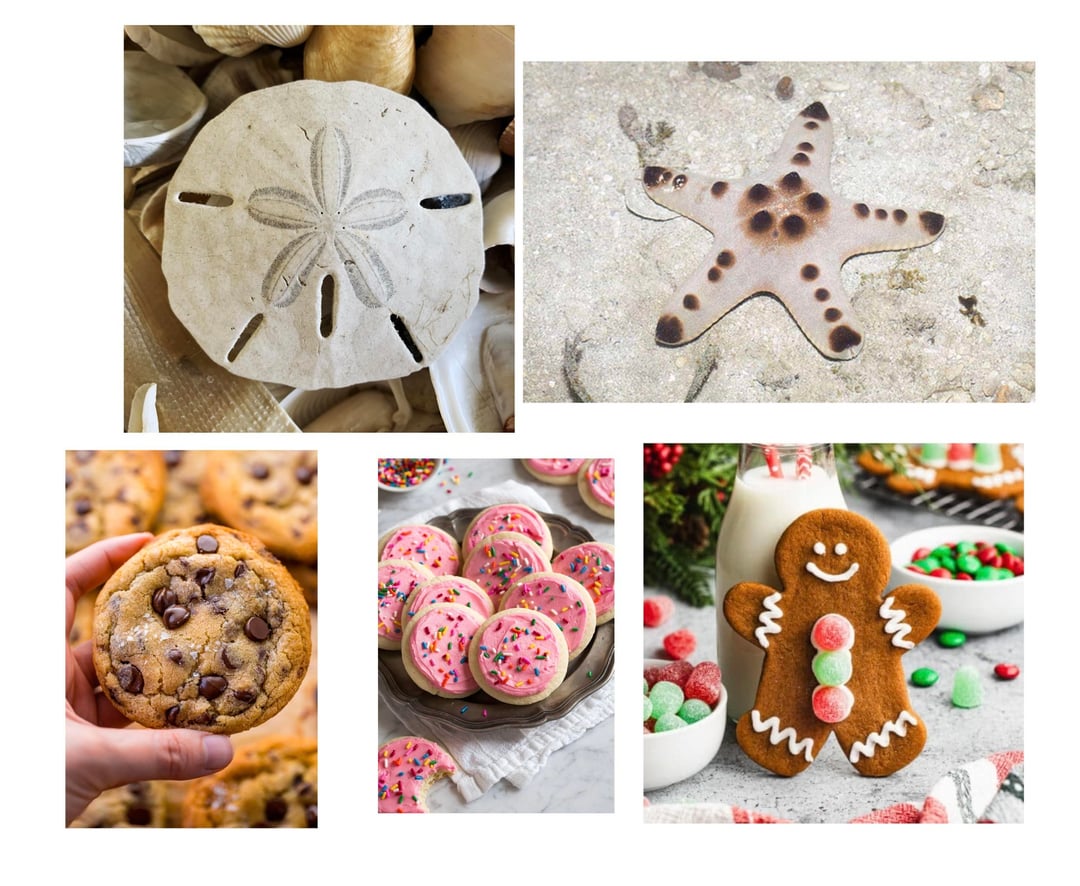 Based on a sand dollar, and the chocolate chip starfish. Both stages take secondary inspiration from different types of cookies.