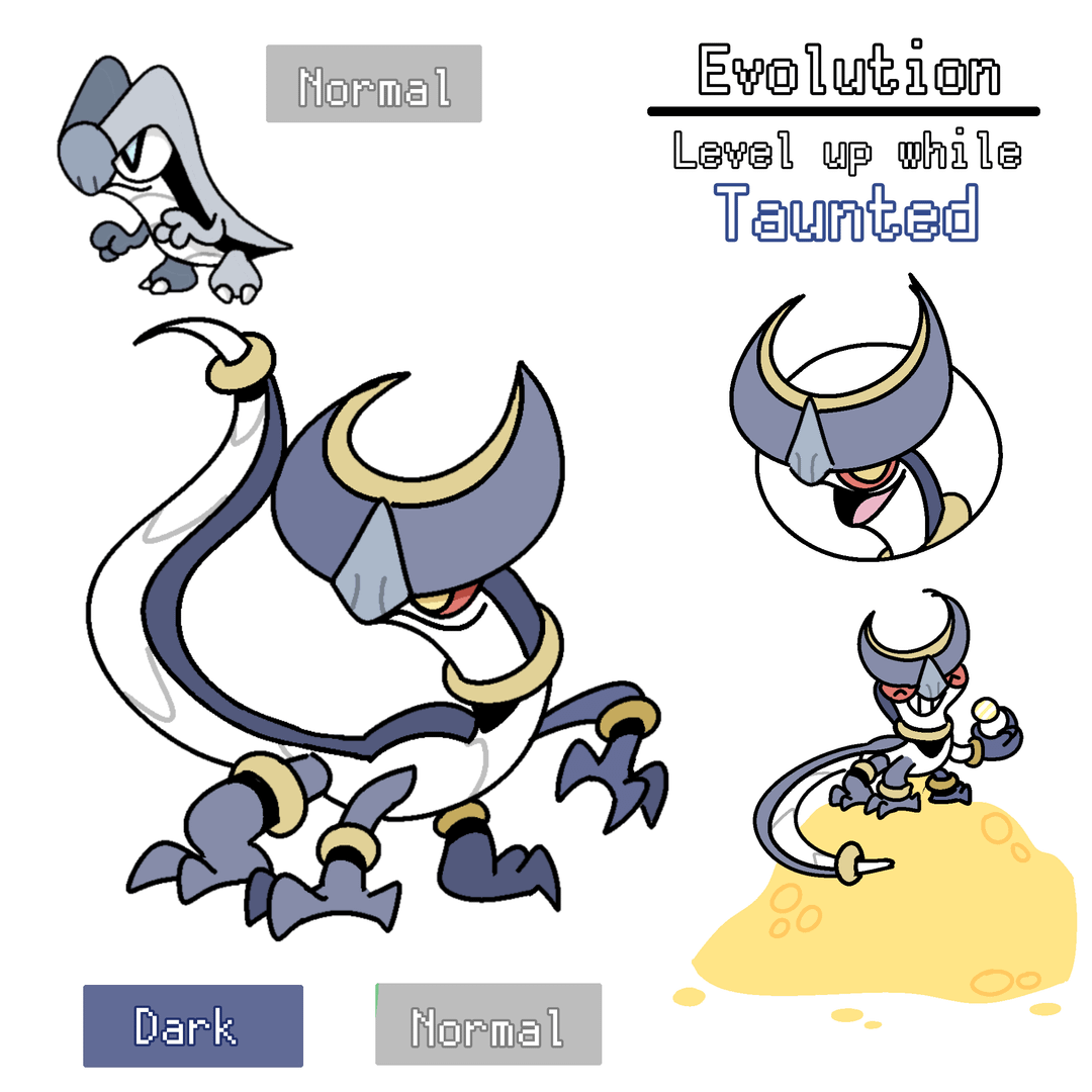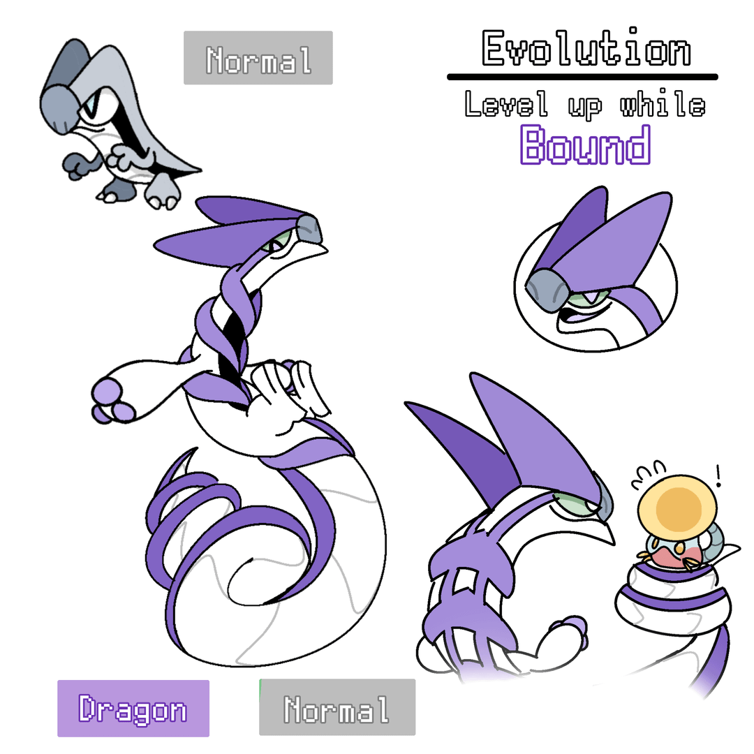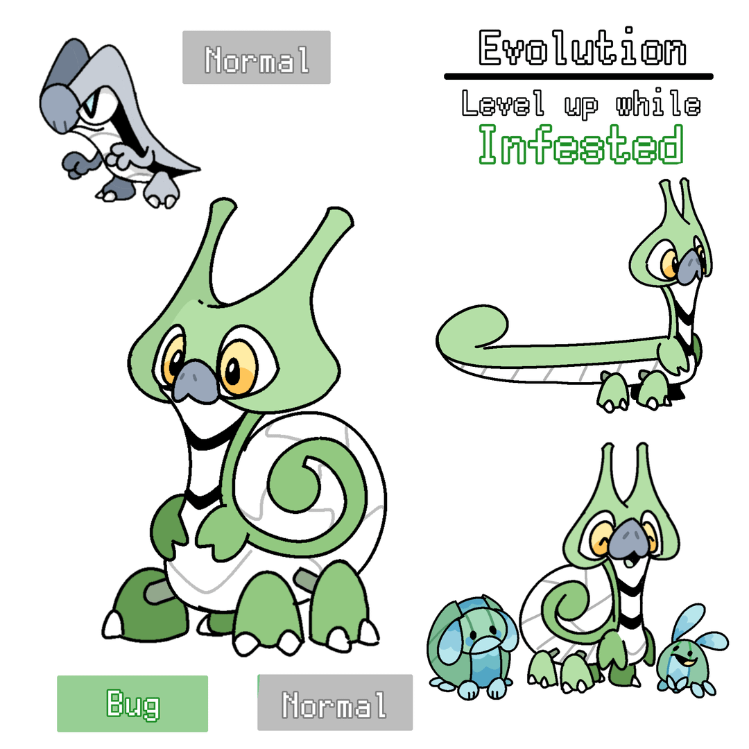 I shared an evolution idea that I had a while ago, where the base stage (Normal) evolves based on what status condition it has upon leveling up. (For example, if it levels up while burned, it will evolve to a Fire/Normal type.)