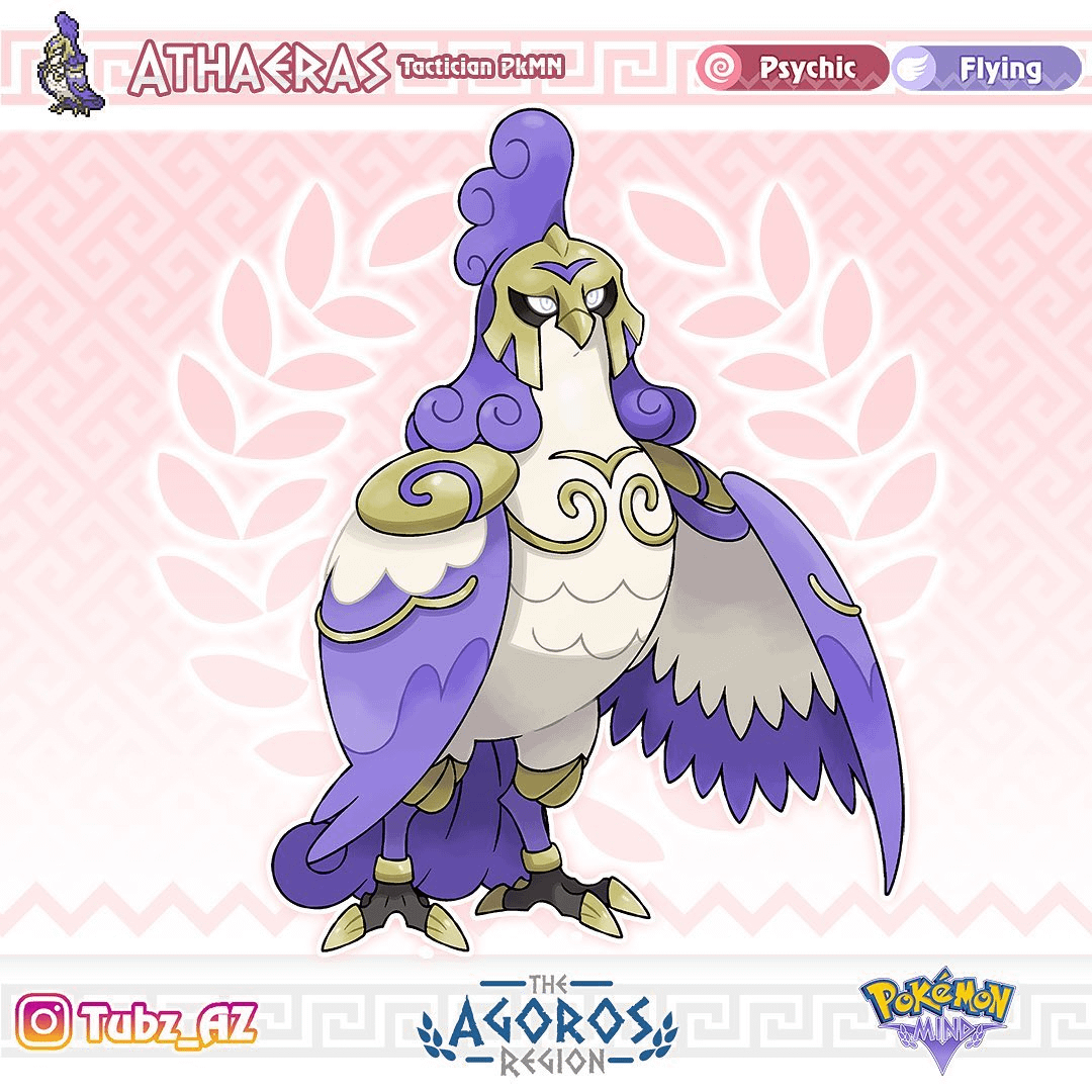 Athaeras is based primarily on Athena, and for body shape, it is inspired by Athena's animal, the owl specifically the Barn owl. The whole idea behind this Pokémon is that both Athena and Ares are war gods, but Athena is known more specifically for superior battle tactics, which would play more into the idea of the mind.