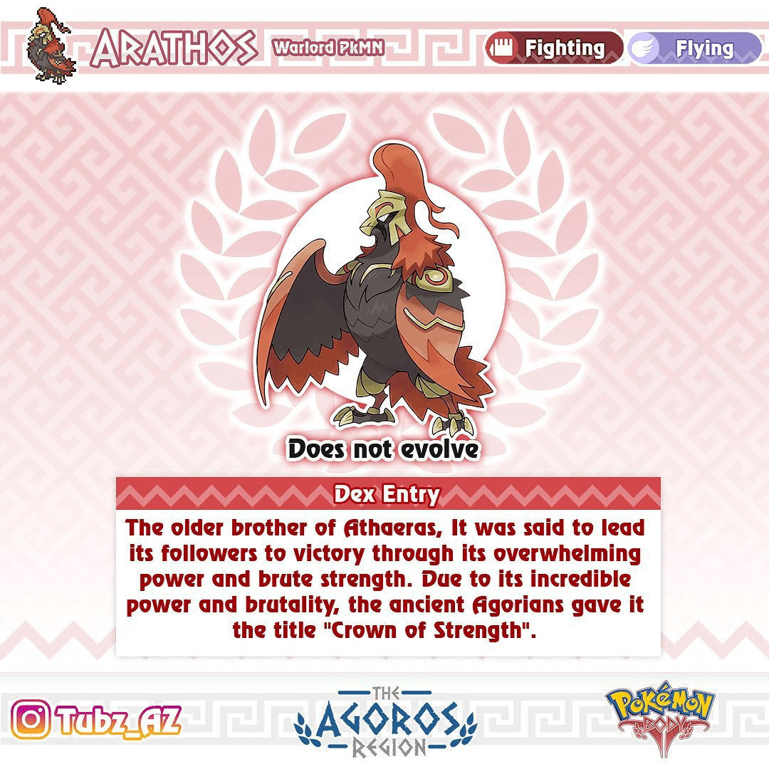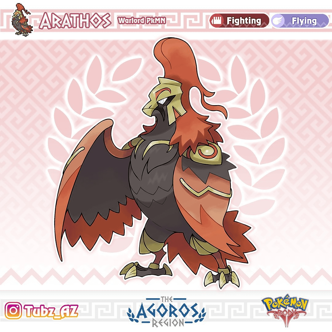 Arathos is based primarily on ares, pulls both its color scheme and general body shape from the bearded vulture, which although not specifically that species ares is associated with vultures. as a part of the duo with Athaeras, Arathos represents the more physical and brutal sides of a war god which is reflected in their being the pokemon body box legend.