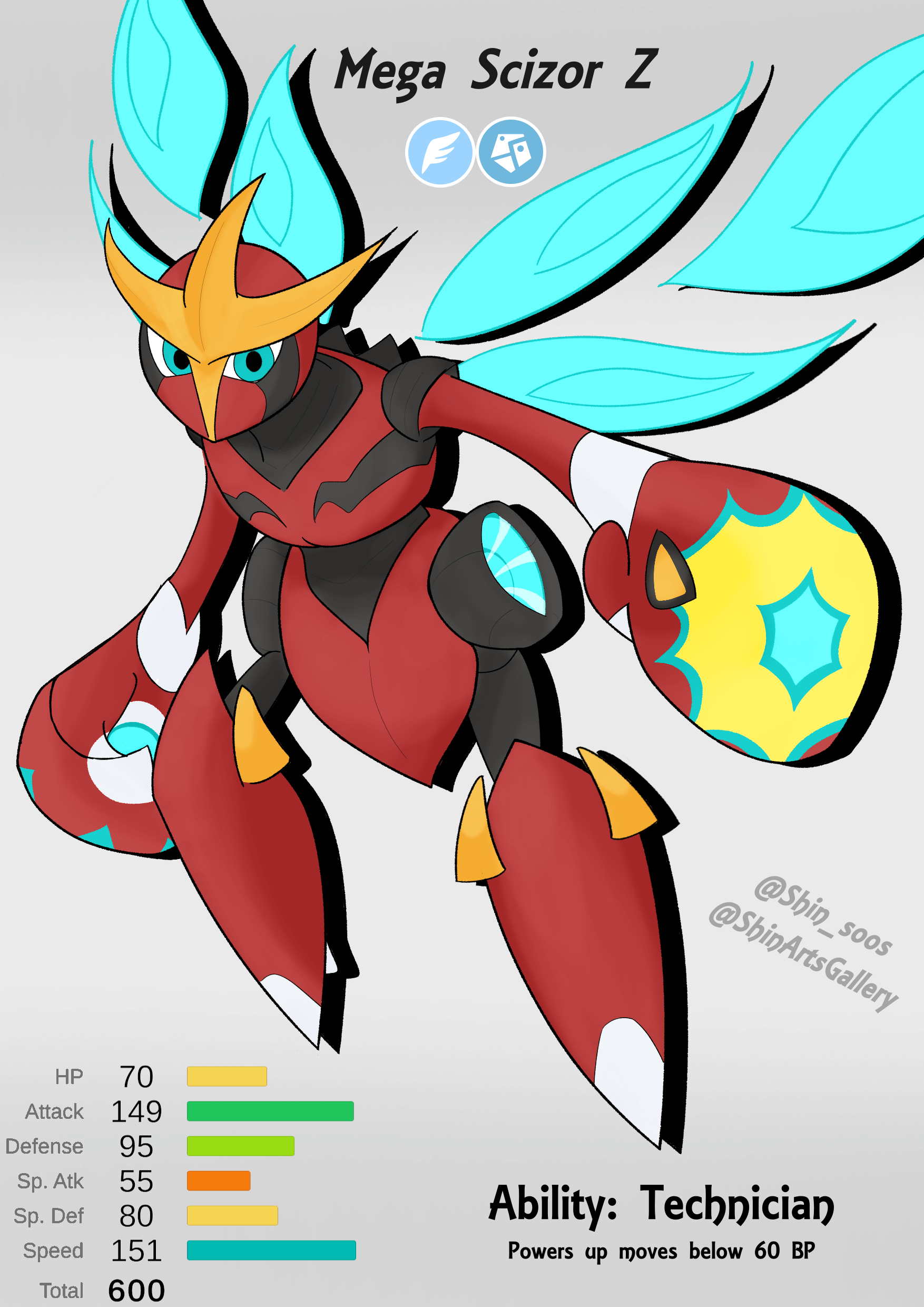 "When Scizor Mega Evolves, its wings transform as powerful thrusters grow from its metal armor, allowing it to fly at extreme speeds and perceive movements far faster than normal.