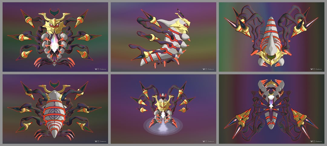 It is meant as a "Primal Reversion" sort of scenario: something that could happen at the peak of its rebellion against Arceus, as Giratina harnessed some energy from the Alpha pokemon. Thinking about its lore, I included many nods to Arceus itself in G-Ø's design, most notably its core acting as a white hole.