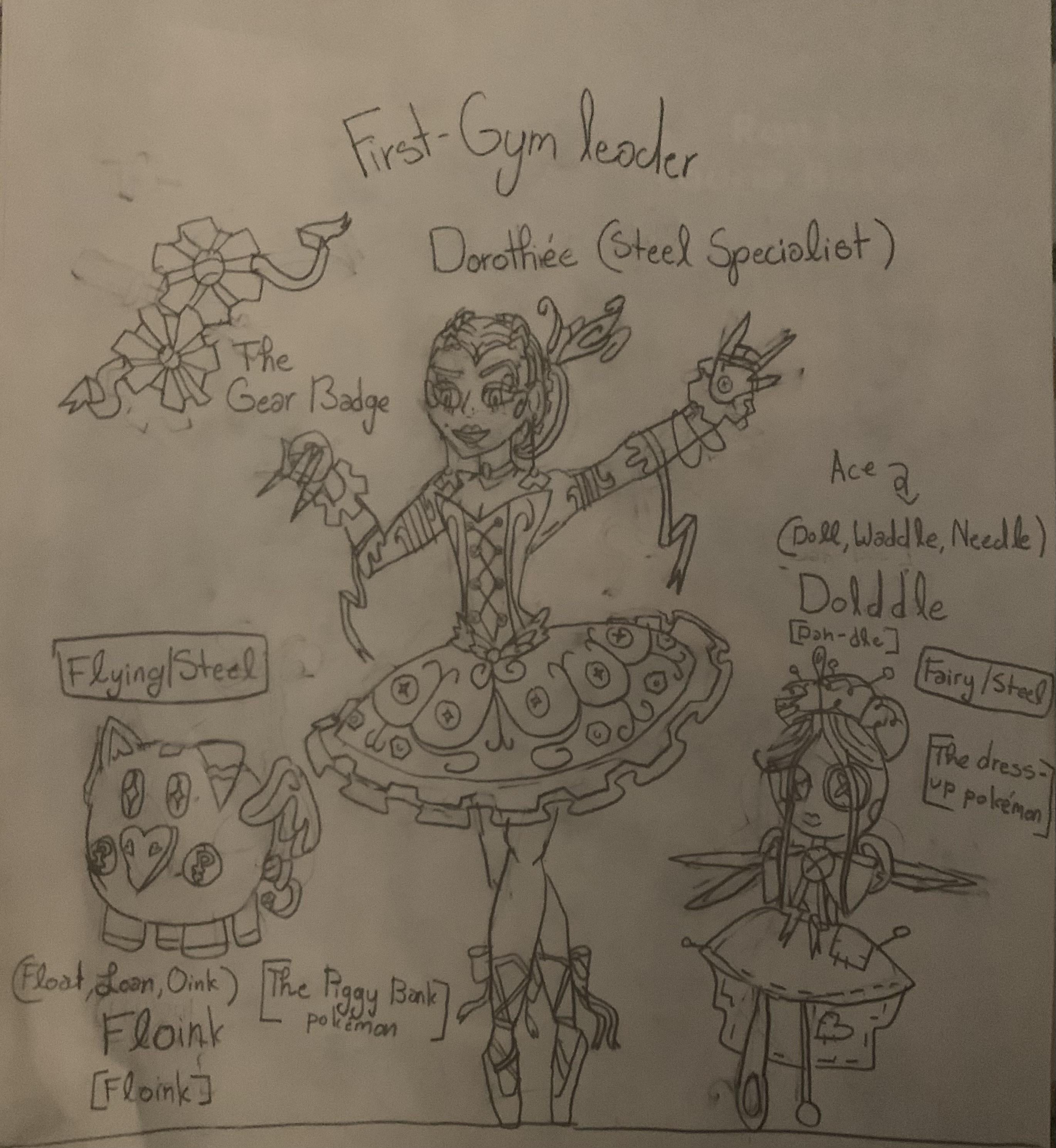 Dorotheé was born in Paldea. She had many dreams as a child, they lived in Paldea up until Dorotheé’s mother died so they moved to Kalos. Dorotheé’s father was a Mechanic and worked many hours. It paid off because on her tenth birthday, her father gave her a Pokemon not from Kalos but from a region across the ocean, the Scintella region. The Pokemon was Dolddle they became inseparable. On Dorotheé’s 18th birthday her father announced that they will be moving to Scintella. She was ecstatic. Years later she found success as a ballet dancer and a pageant queen always with Dolddle by her side. Dolddle always designed her dresses. She dedicates her career to her father and decides to become a steel type gym-leader while still preforming. She gives out the gear badge with is mechanical and is paved with ribbon making it still seem elegant. Her underskirt and her bracelets are all shaped like gears and has screw motifs on her dress. She gives everything to her father since he gave everything to her.