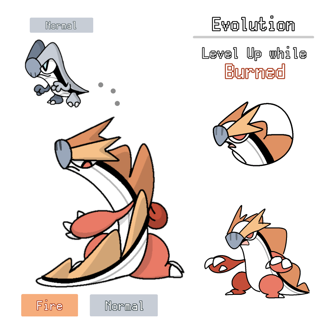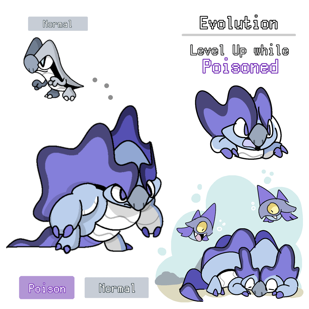 The base stage (Normal) evolves depending on what status condition it has upon leveling up. For example, if it levels up while burned, it evolves into the Fire/Normal; if it levels up while poisoned, it evolves into the Poison/Normal, and so on.