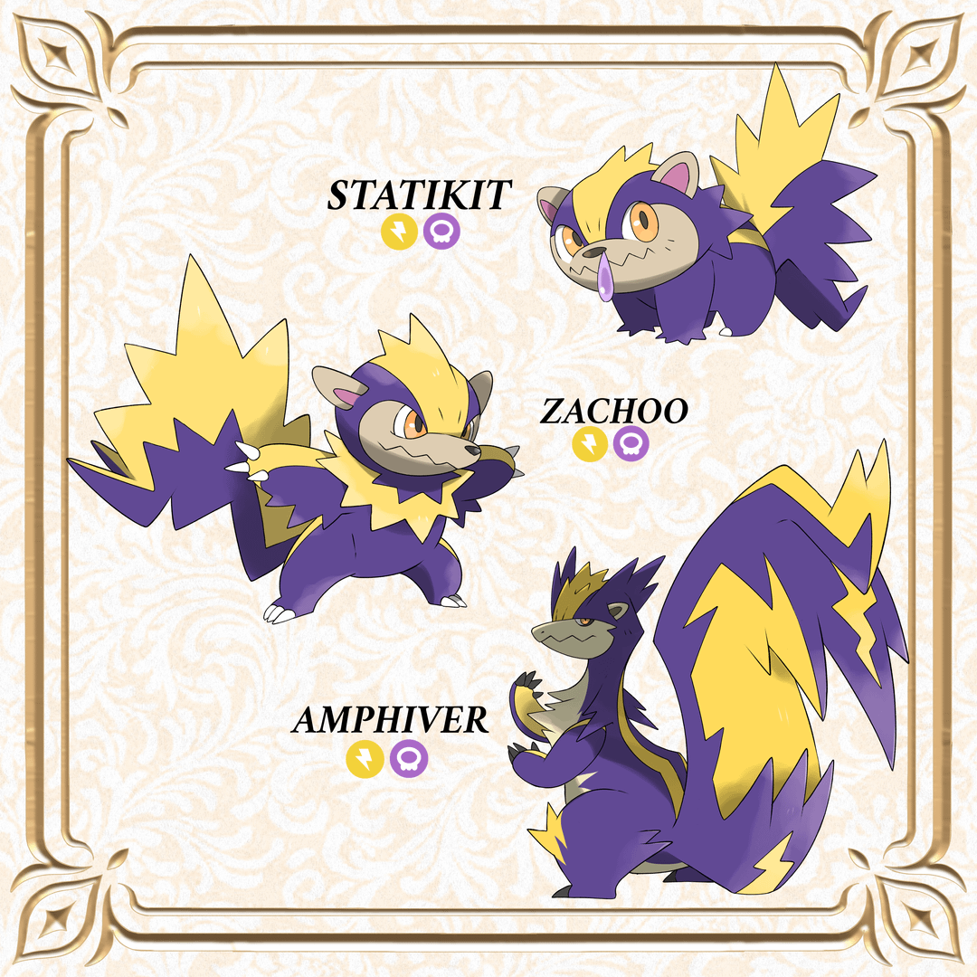 So these guys are some electric skunks, while also looking a bit draconic at the end. If this was still a pokemon fan game thing, this would have been my final pseudo of my region, but their concept got changed a bit when I decided I didn't want to do a pokemon fan game anymore. As skunks, they do have their typical poison type that people would assume a skunk would have, but there's another layer on top of that. Their gas/spray is so potent, that even they themselves are affected by it. Their reaction to it is basically like they're allergic to their spray, so they sneeze uncontrollably, thus releasing surges of electricity when they sneeze. Which is also why their fur is all over the place, cause static makes your hair stick up, so these guys can never have their fur in any other position. Statikit is static and kit (a baby skunk) combined, Zachoo is zap and achoo, and Amphiver I think was amp, mephitidae (scientific name for skunk), and fever. I also aimed to not make them look as cool and badass as most of my creatures do, went more for the powerful but goofy and lovable type of look, like Dragonite and Goodra, so hopefully that was achieved