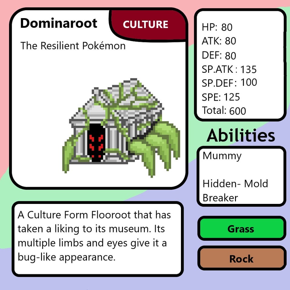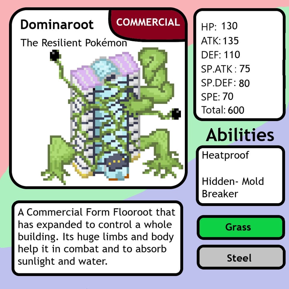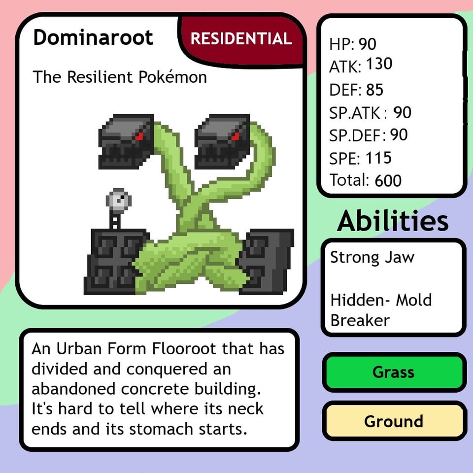I feel like Residential Form Dominaroot shouldn't have small vines due to them becoming its more snake-like body, though I don't know if I should add them for consistency's sake.