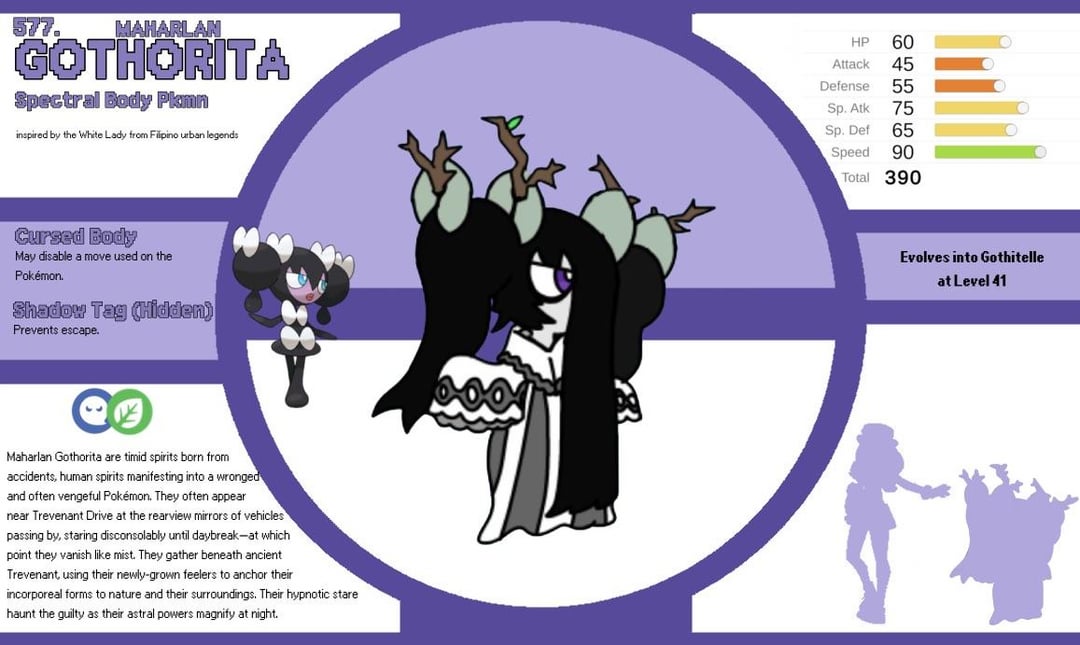 This regional Gothitelle line was inspired by the kaperosa/White Lady, a spirit that haunts Balete Drive (along with other “white lady” spirits around the world). The woman was said to die in a car accident, and is still hitchhiking to this day.