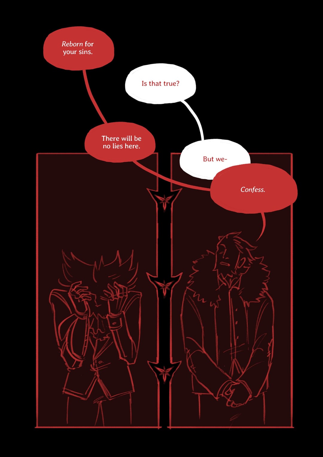 Made this after musing a conversation between L and Lysandre, and how they are different people but also one and the same. It was very much intentional to make L the antagonistic party here, and for speech bubble colours to be mixed up often. I dislike the "L is a completely different person" thought, and more… it's him if despair didn't overtake him. Regardless, I like him being extremely troubled, before and after.