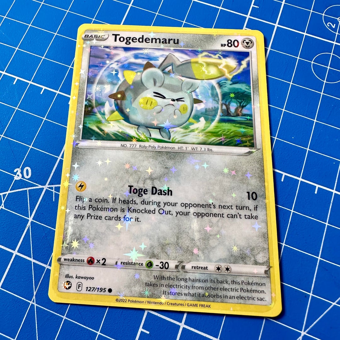 I love how round Togedemaru is 🥹 I drew her on hot press watercolor paper, then cut her out and glued her onto an official Togedemaru card. She's drawn with sharpie, acrylic markers, and gel pen. I added a sparkling holographic film to the back, too. Hope you like it! 🙂