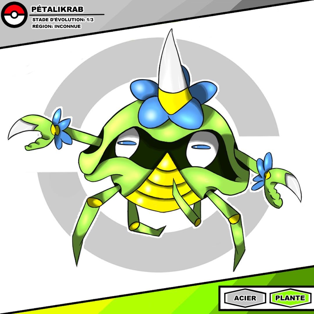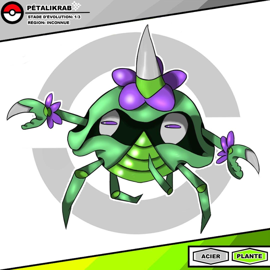 Petalikrab is a Pokémon whose green shell, shaped like a spiked, flowered helmet, protects it and helps it blend into tall grass.