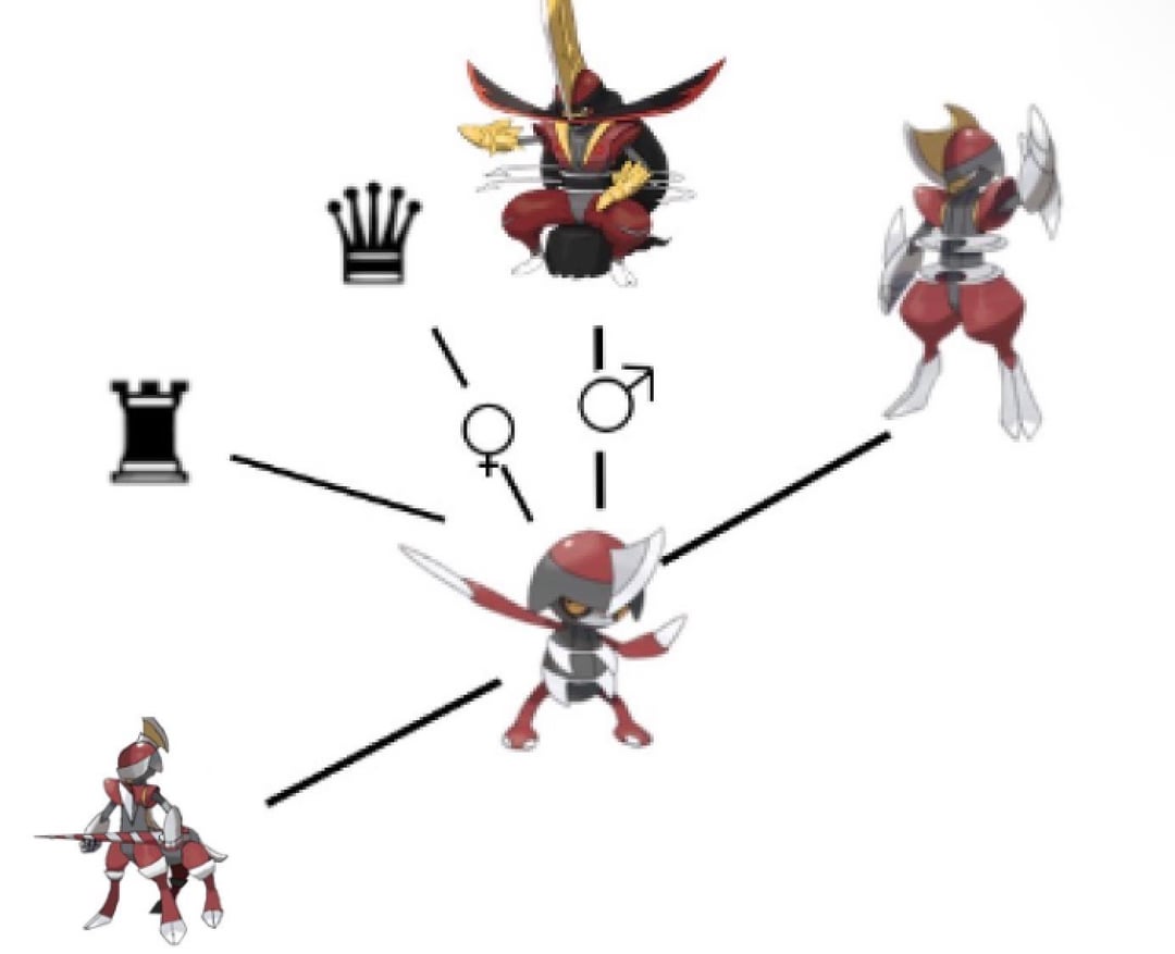 so the idea for this knight based evolution is based off how pawniard in my opinion evolve pawniard is based off a pawn from chess which when reaching the end of the board turns into any other peice exept most people choose the queen but it’s not the only one it can do but in Pokemon pawniard evolves into a bishop than the king so I am forced to keep the king because well it’s already there and but think it would work better if pawniard evolved directly in kingambit or queengambit depending on the gender for a harder to get and stronger evolution or 3 other chess peices this Pokémon bisharp and one for the rook that I haven’t made. Bisharp would be And Is heavily attack based this pokemon(which I don’t actually have a name for) would be heavily speed based and the rook would be defense based