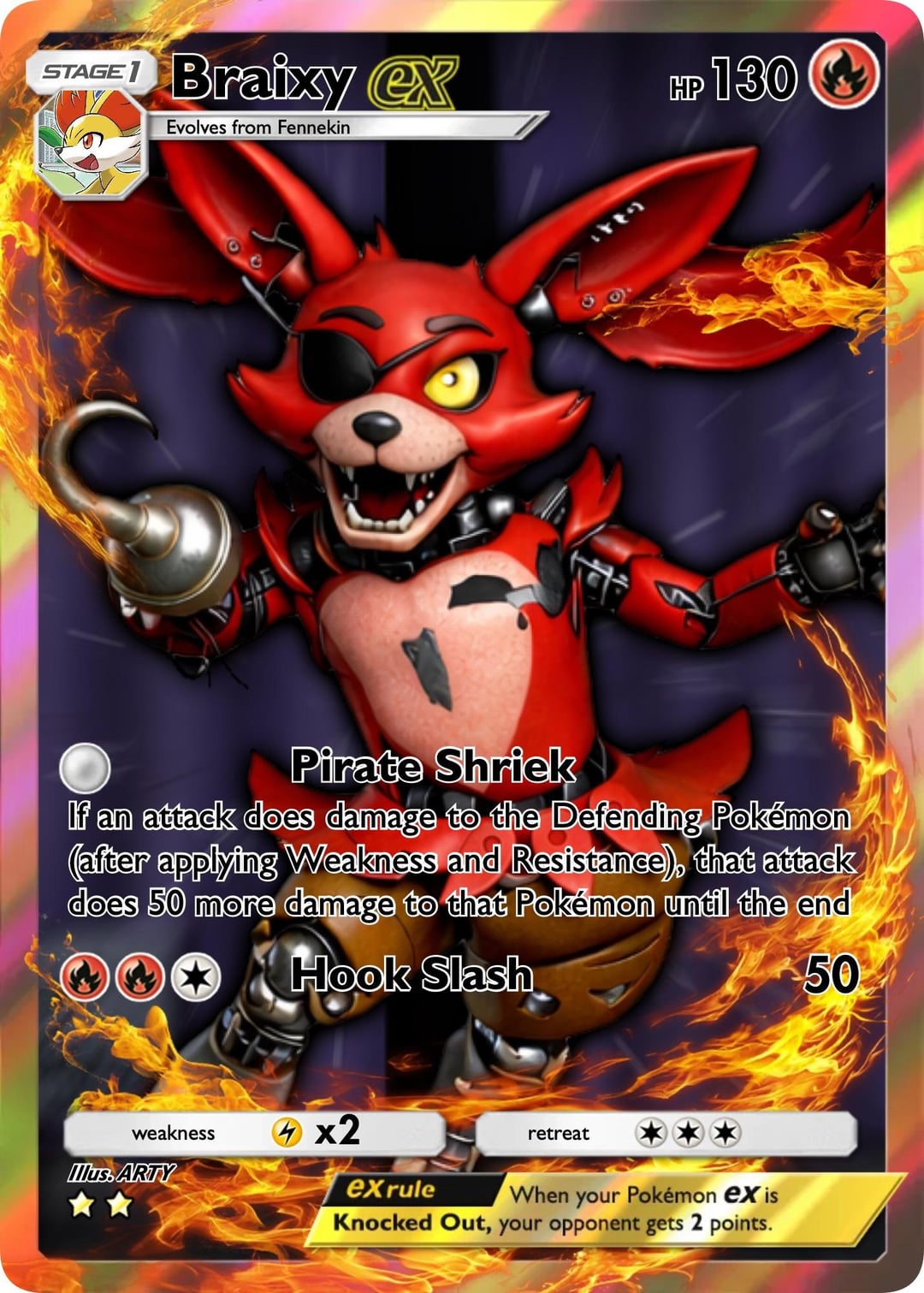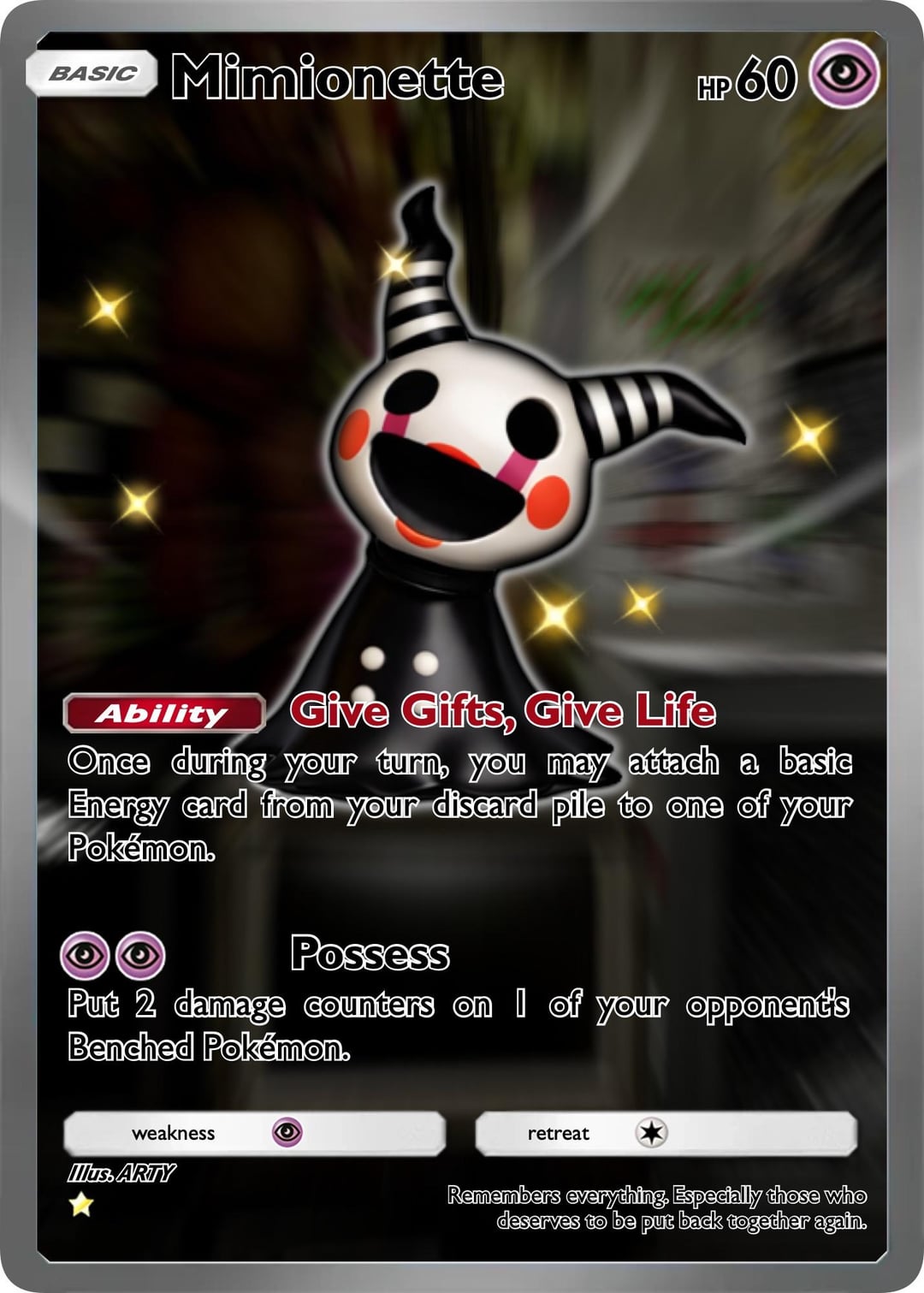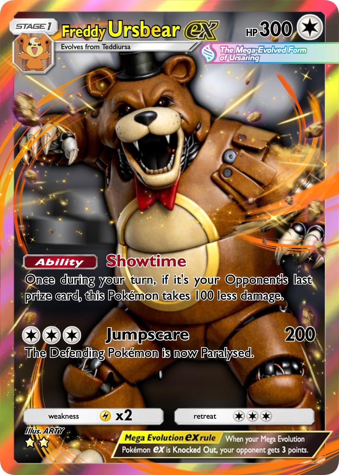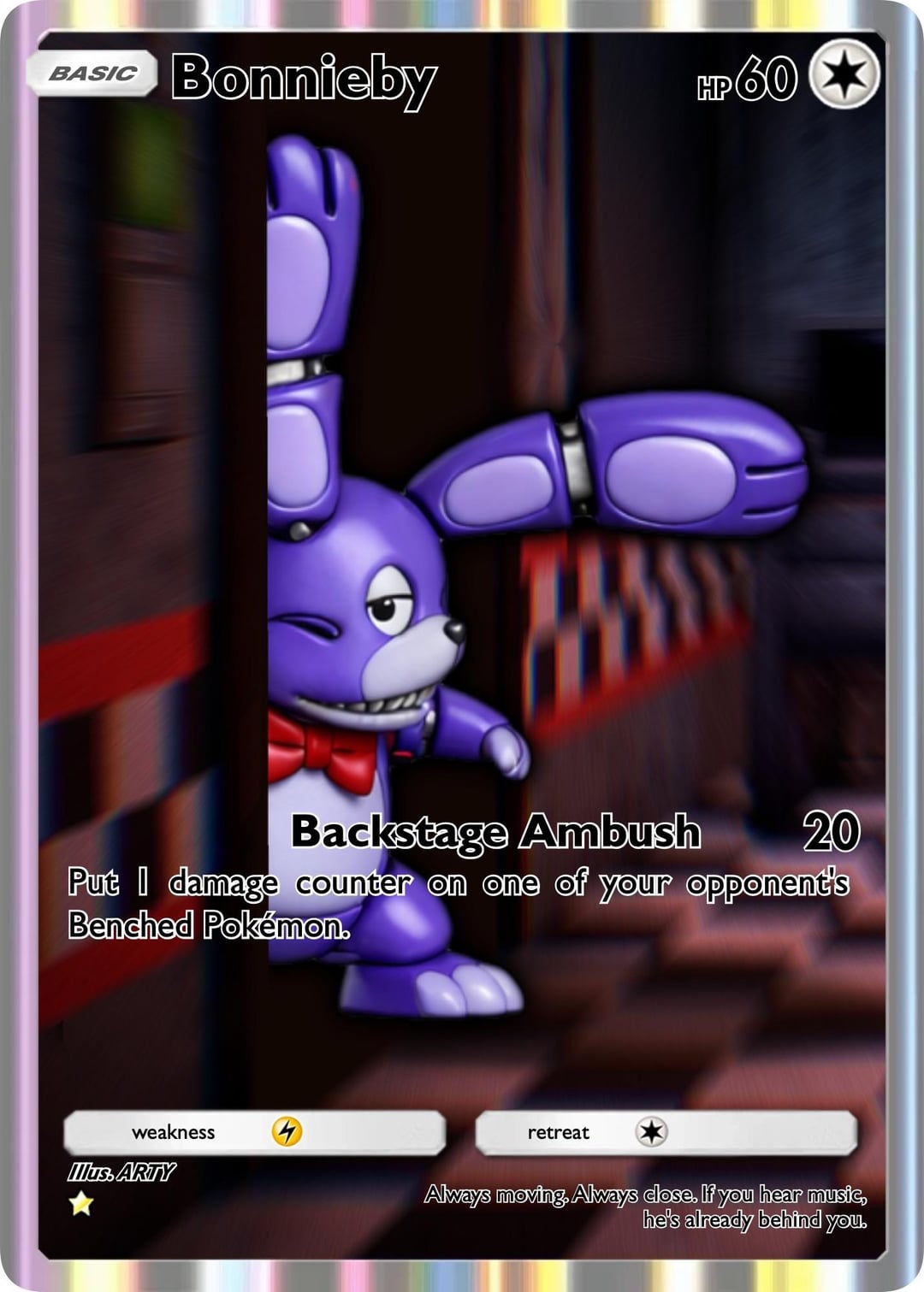 Made a friend at work some custom Pokémon/FNAF cards for her son who’s having a tough time. Thought I’d share in case anyone wanted to create their own versions or just wanted their own… so here you go. Thanks for looking.