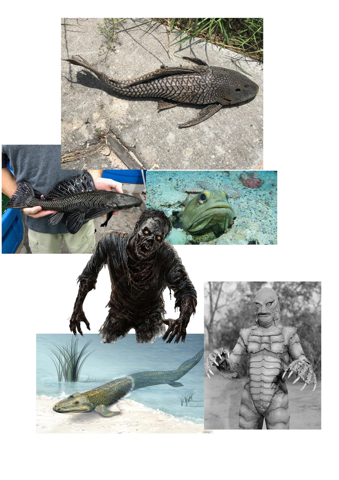 Based on a Pleco fish and their ability to dry themselves out to near death, walking fish, fish bones, the Giant jawfish, zombies, and final evo takes inspiration from the creature of the black lagoon.