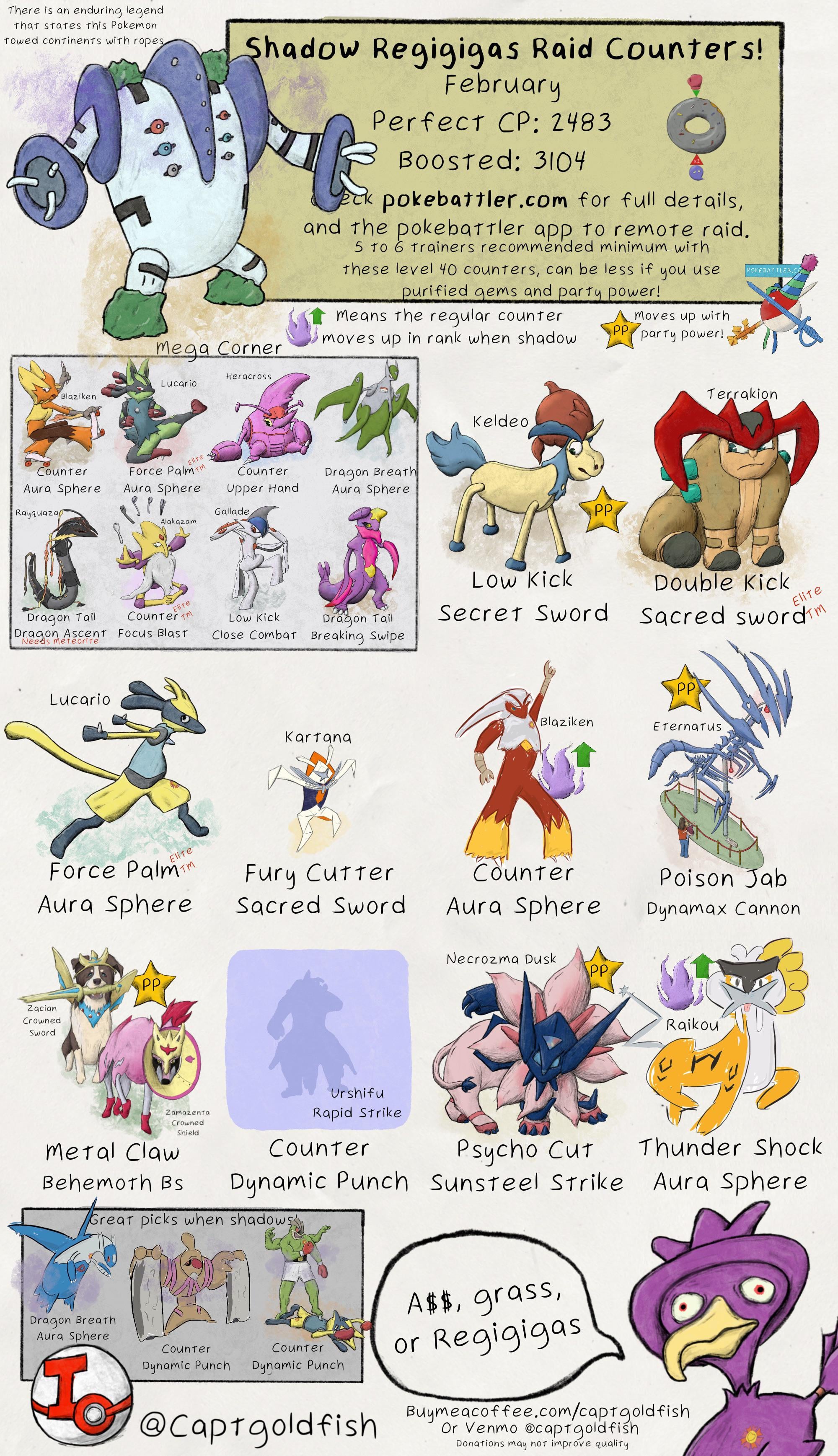 Shadow Regigigas Raid Guide for Feb. Info from pokebattler.com by CaptGoldfish Write A CommentYou must be logged in to post a comment.