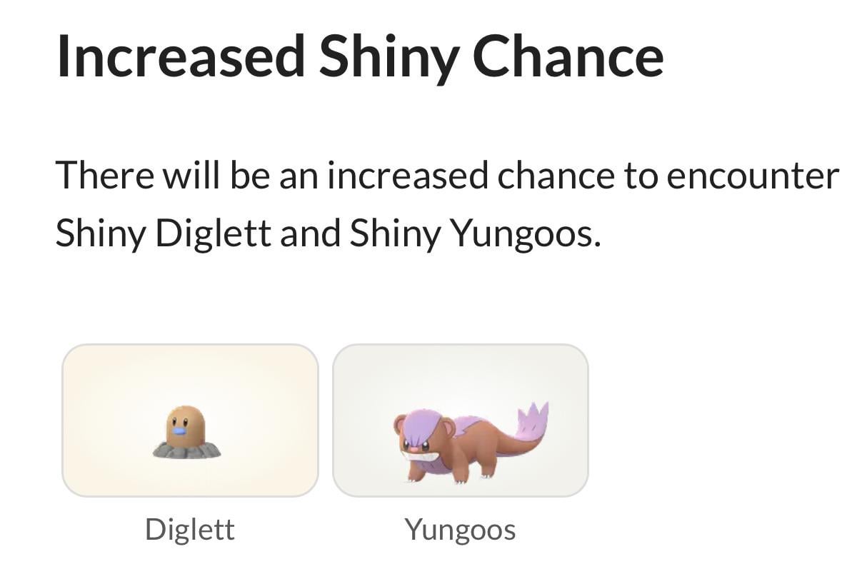 Anecdotal, but I’ve caught 3 shiny yungoos but havent seen any diglett around. Curious how everyone else has fared thus far. by lc0o85 Write A CommentYou must be logged in to post a comment.