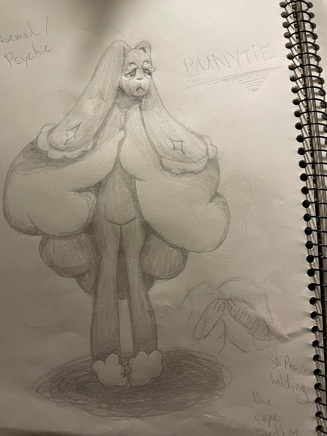 So this is a normal/psychic type with the insomnia ability. It's called Bunytie, pun on bunny + nightie (another word for pyjamas cuz I think it looks like it's wearing fluffy slippers and is v pyjama/blanket wrapped around it vibed).