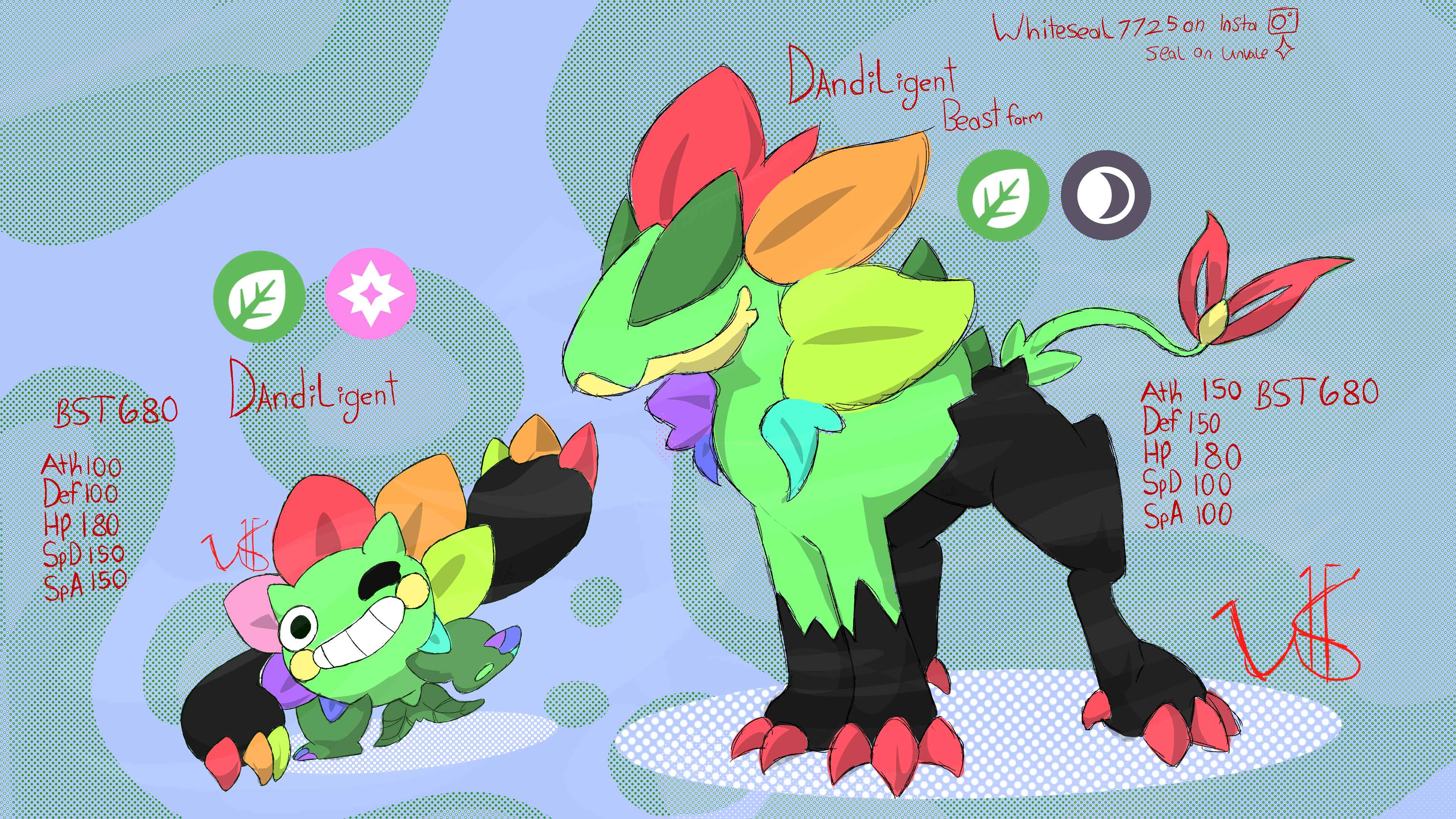 Pokedex entry: dandiligent. The colorful flower pokemon. Dandiligent is normally a very friendly pokemon. They love making trades with people and pokemon. However if they feel they are ignored. It will transform into its beast form and punish those who ignored it.
