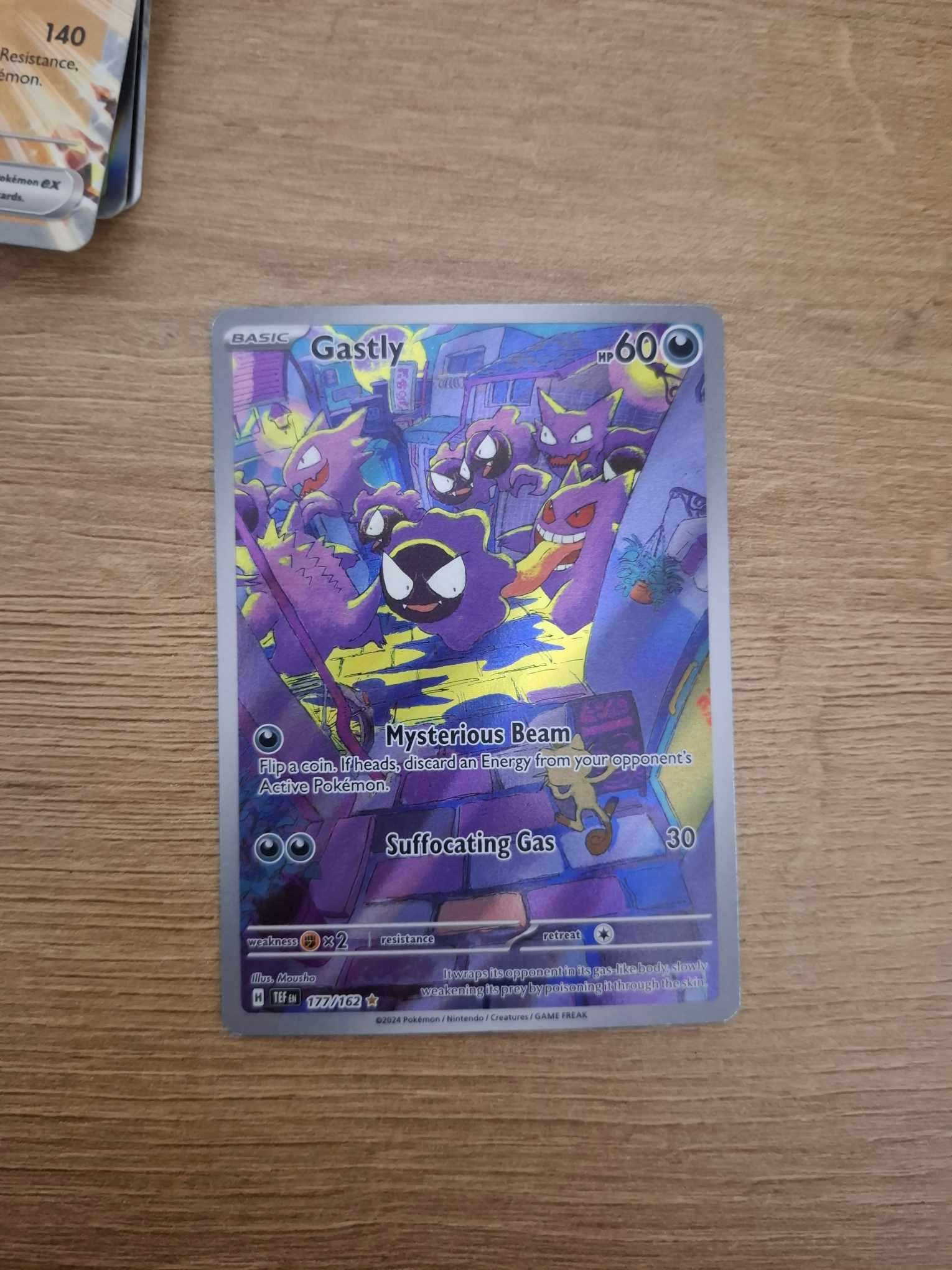 As I posted before I cant get pokemon cards in my country easily. Ther is only 1 toy store that have it (yes toy store a specific one) and they are hell expensive so I could open 1 to 2 packs in a year so its really hard to get SIR or IR cards (I cant even think of special cards like golden cards in the new sets) im really in love of pokemon tcg (all tcg cards) i am following for around 4 years (really started form evolving sky's) and what u see in background is all I have rn and my goat freand gave me his gastly IR from temporal forces (he pulled it in first try) and he didn't keep it that bad at least didnt destroyed it cuse when he pulled it i said "DONT DESTROY THAT KEEP THAT ON A PILLOW" and now I have a card worth around 50 usd (yes thats a hand made sleave that i made from zipper bag XD)