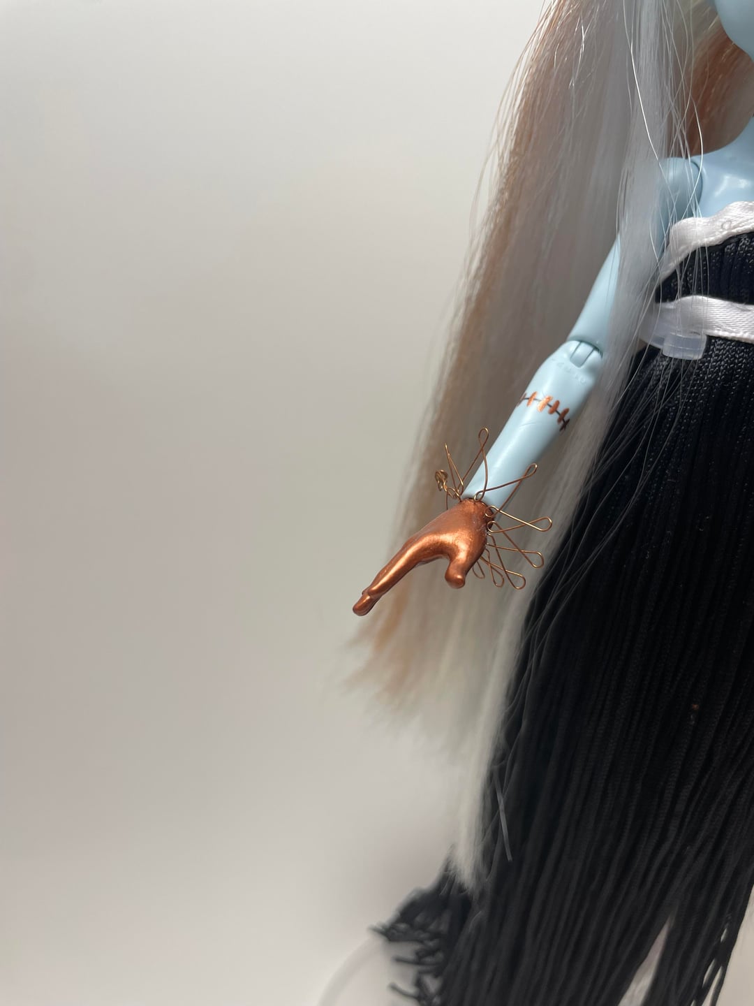 Because of Xurkitree’s hands being the inside of a cable, copper wire, I painted the hands on the doll copper, and used some copper wire to sort of give a nod to the pokemons hands.