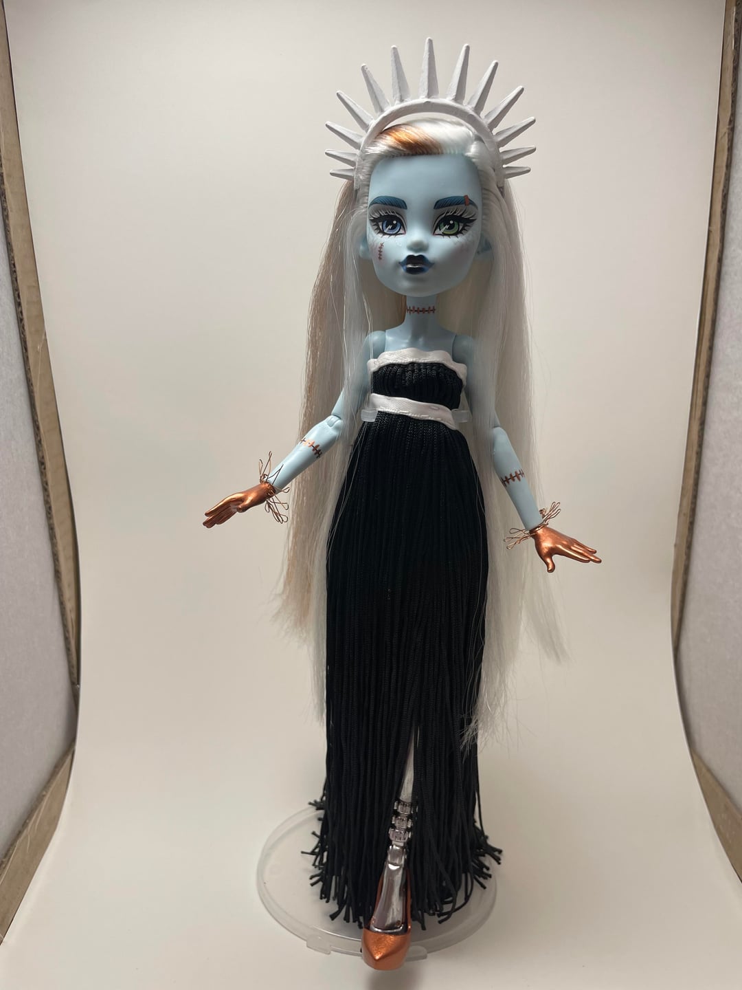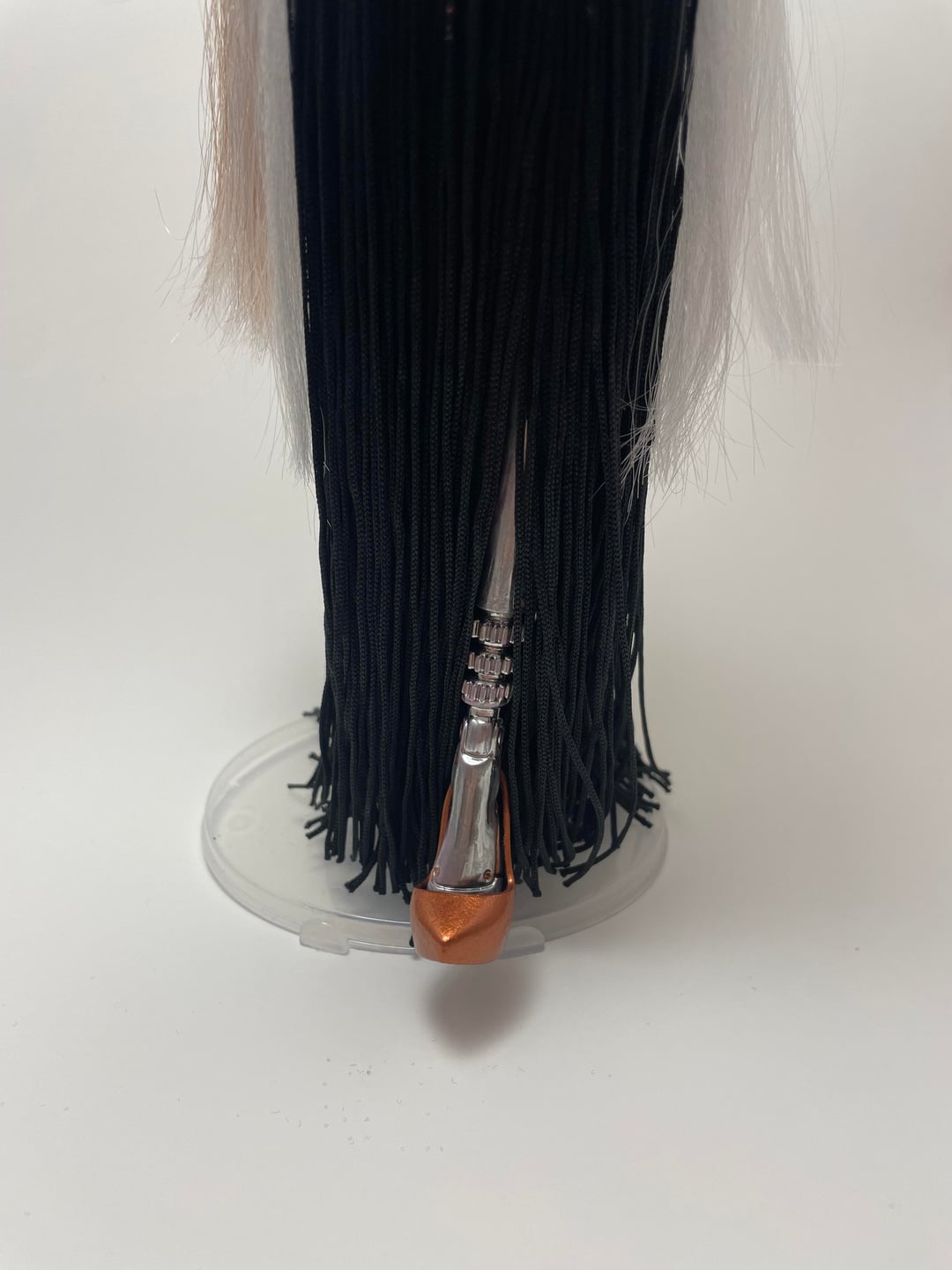 The cable/ cable tie limbs that xurkitree has translated to a fringe dress, with some ribbon used to mimic the cable tie parts. I’m still not sure what to use to be the tabs, but until i do, the doll is complete.
