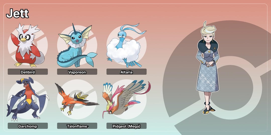 Jett: Her name in multiple languages is related to jets and airplanes so flying types are a given. Also threw in a couple Pokemon that mention jets because why not. Talonflame and Pidgeot are fast flying types, Garchomp is described like a jet sometimes, Vaporeon is the water jet Pokemon, Delibird seems like a Pokemon that a ceo who tries to look good for the people would have and Altaria just seems to fit her a bit.