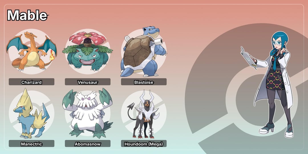 Mable: Really surprised you never got to face her. Anyway, basically made her team using a combo of the idea of Sycamore’s battle (the 3 starters) and her team flare past ( Manectric was used by Celosia, Mable almost hurt an Abomasnow and her partner Houndoom).