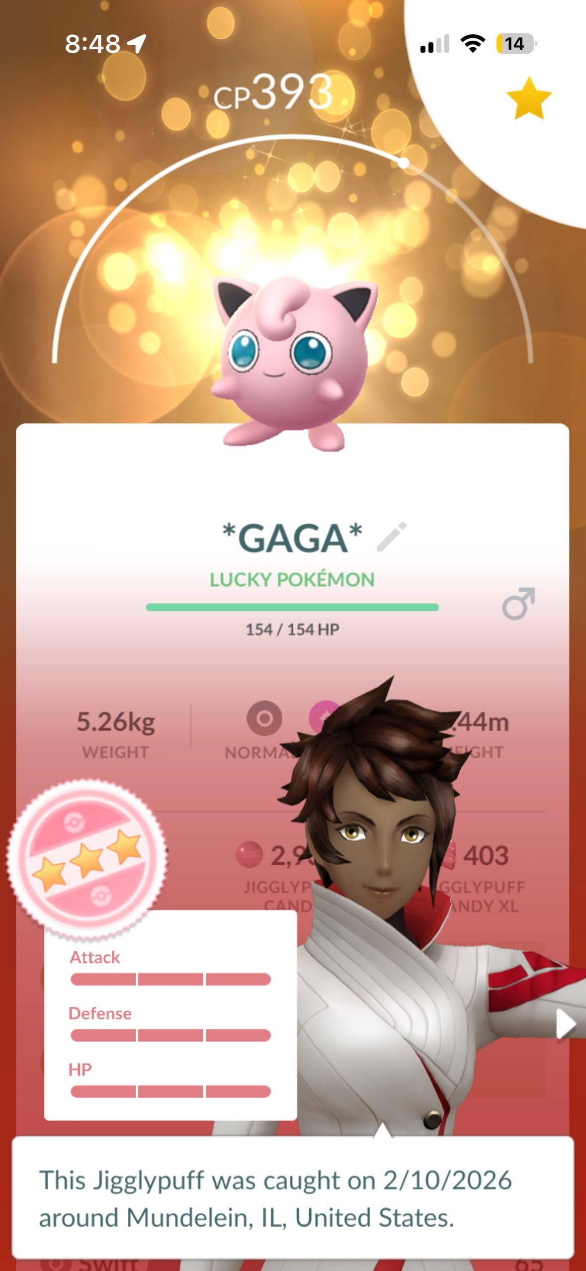 I, along with millions of other people tuned in to the big sports ball game, just a couple days ago found out that Lady Gaga not only likes Pokemon, but that her favorite Pokemon is non other than Jigglypuff! So when I got this surprise lucky hundo Jigglypuff in a trade today, I knew I had to name it after her!š„°
