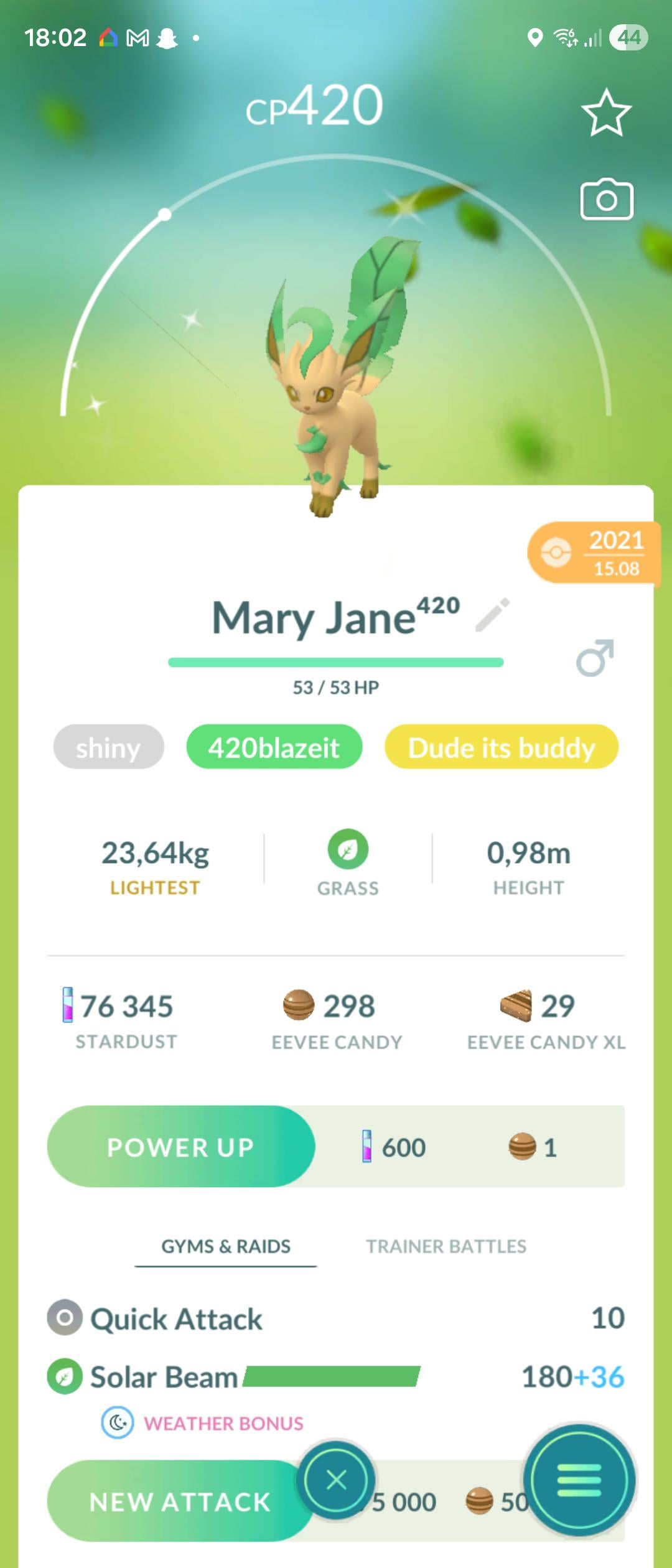 this is my flex, i evolved a shiny Eevee into Leafeon few years ago and got this beautiful little Leaf in 420cp