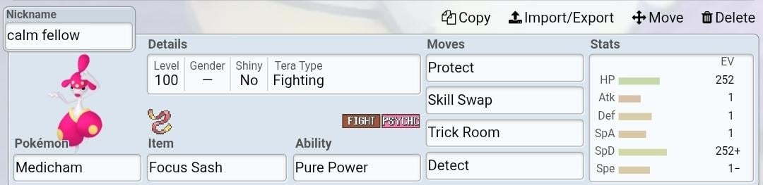 first, you need a snorlax with high physical attack and defence/special defence/hp stats (make sure that the hp stat is not only hight but also an even number, ill explain why later) then you NEED to make him as slow as possible. give him the move belly drum and the other 3 can be anything. id recommend earthquake(targets both enemies and has high dmg), protect and body press just in case of flying types. then finally give him the ability gluttony and a berry so when he pops the belly drum, he eats the berry right off the bat so he's only on 75% health (if the hp stat was on an odd number, the belly drum wouldn't technically half his health, therefore not allowing him to eat his berry). now for the medicham, give him high defence and speed, neglect the attacking stats, hes purely support. give him the moves trick room, skill swap and some other defensive/supportive moves like protect or detect. finally give him the ability pure power and have him hold whatever item you want (i recommend focus sash or air balloon to counter snorlax's earthquake).