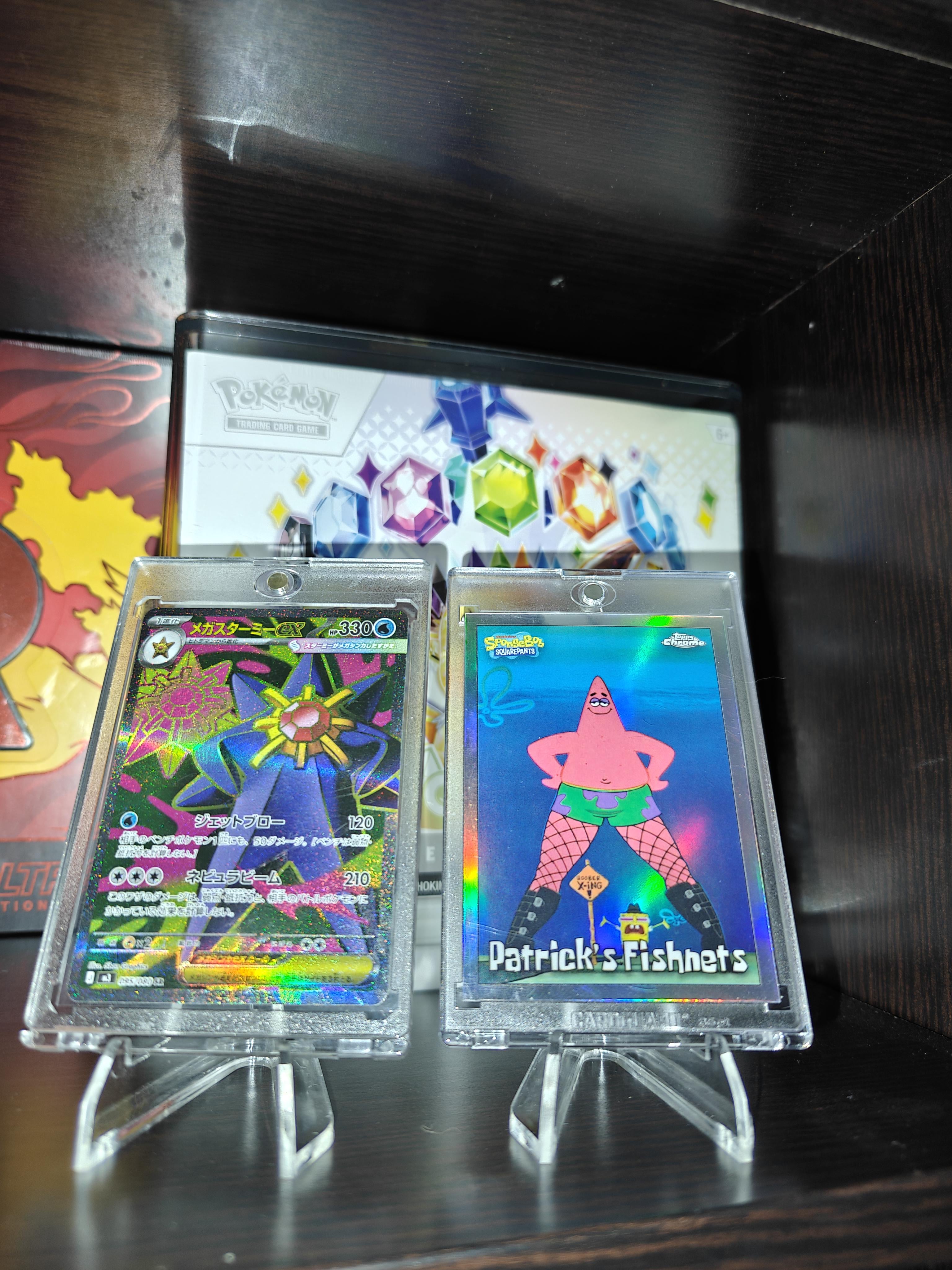 On the left, we have the new Starmie ex (Tera Stellar) looking majestic and powerful. On the right, we have the legendary Patrick’s Fishnets Topps Chrome.