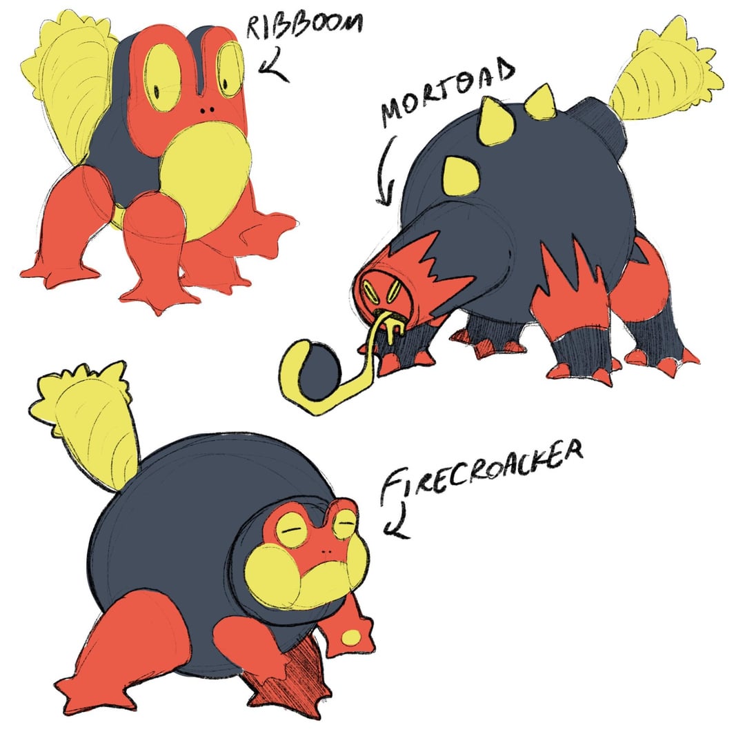 This is the first fakemon that I’ve seen with a “bomb with a fuse” design based off of toads/frogs. This is so clever! The names and designs look good, too!