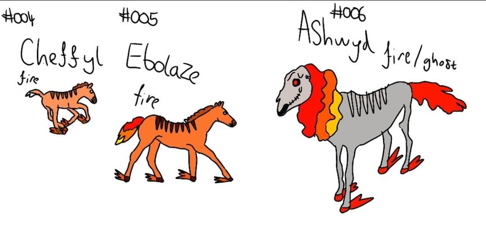 The fire type line is based on a horse then the final evo is based on the "Mari Lwyd" which is a Welsh folk custom using a horse skull