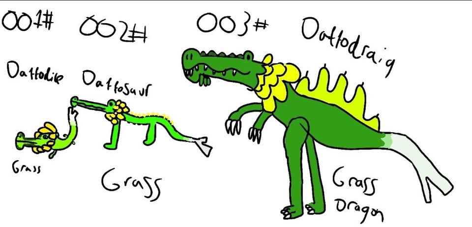 The Grass type line is based on a type of crocodillian mixed with the leek and daffodil which are welsh symbols. Grass and dragon type at the end