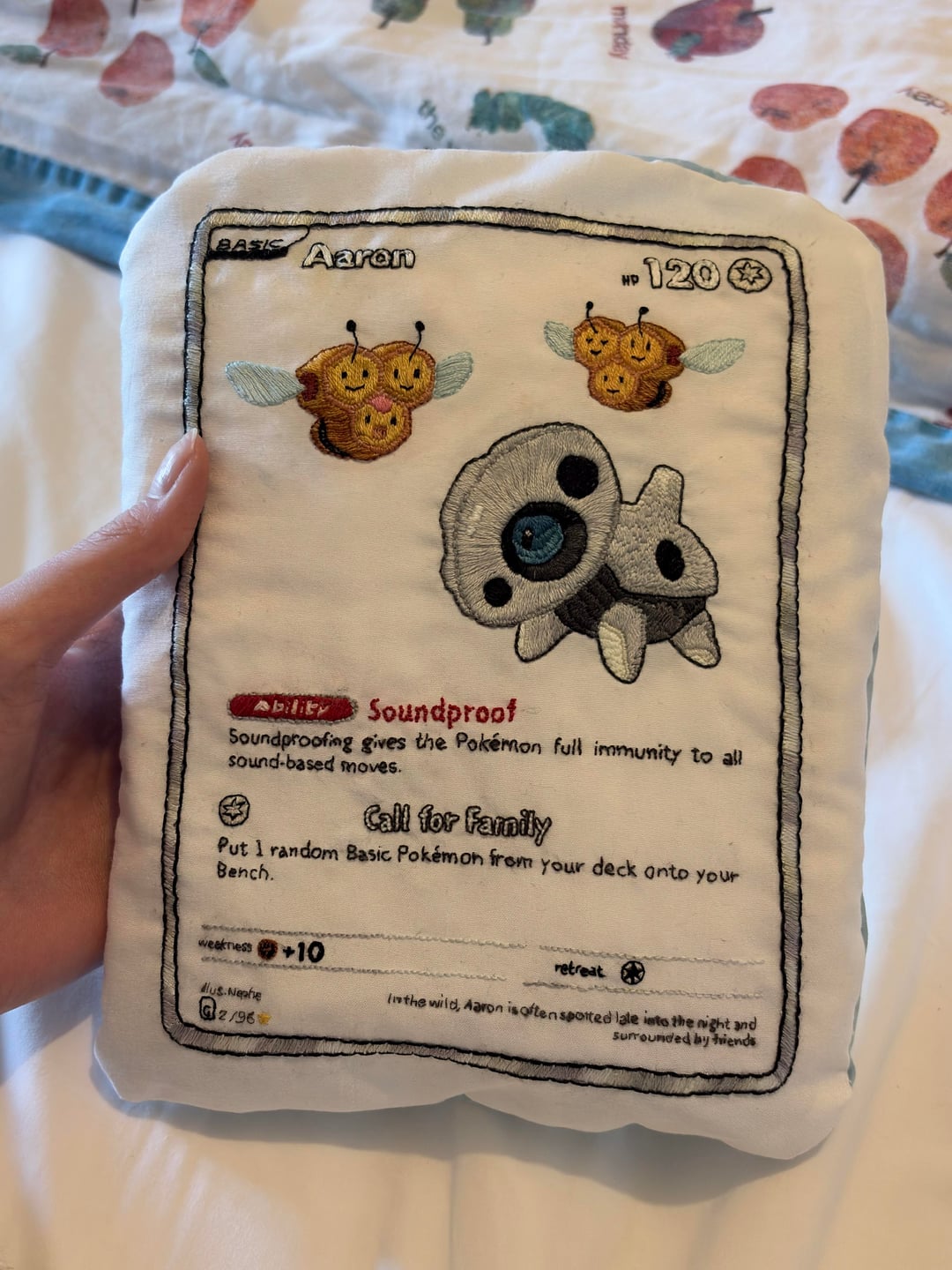 I hand embroidered this Pokémon card pillow for my best friend’s 30th birthday
