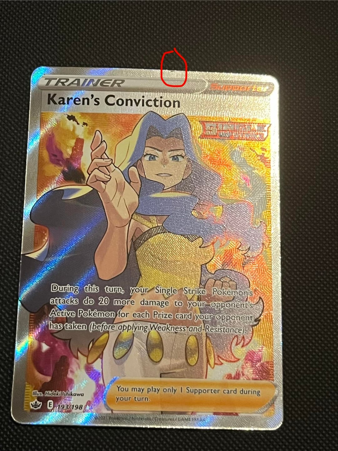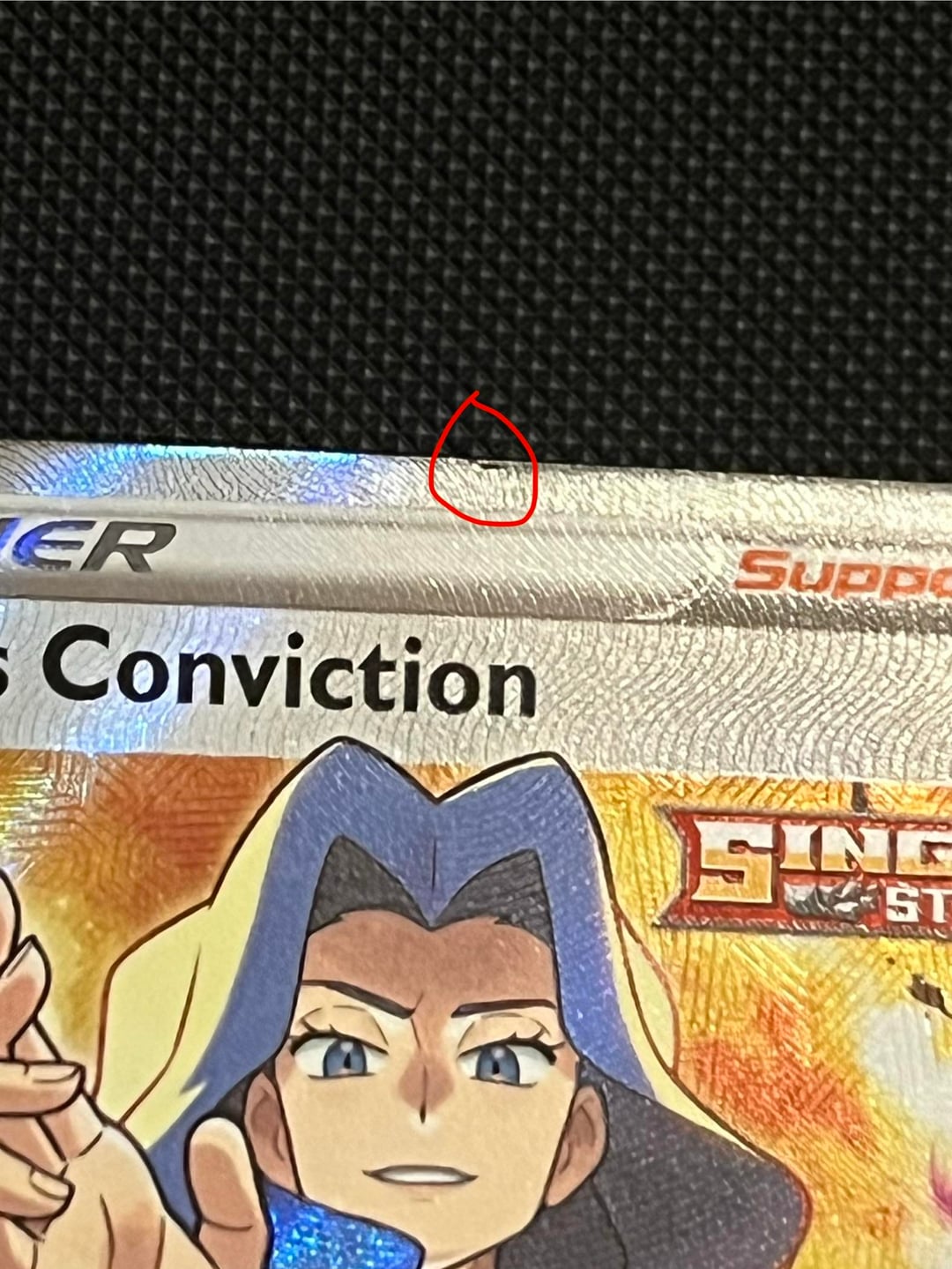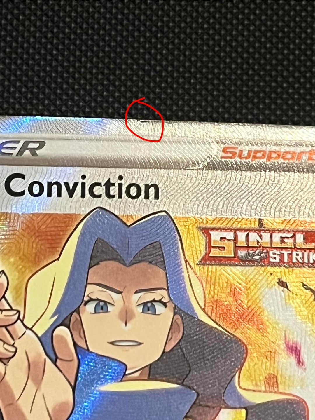I bought this off a seller the other day online and asked if it was near mint because the photo I saw was a bit blurry and thought I saw a dint at the top of the card. They proceed to say they sleeve it after they pulled it and threw no whitening on the sides. A couple days pass and I go to the post office since there was a postage due for $5 to pick it up. I think it’s a manufacture defect but idk if it’s fair that I return it or not