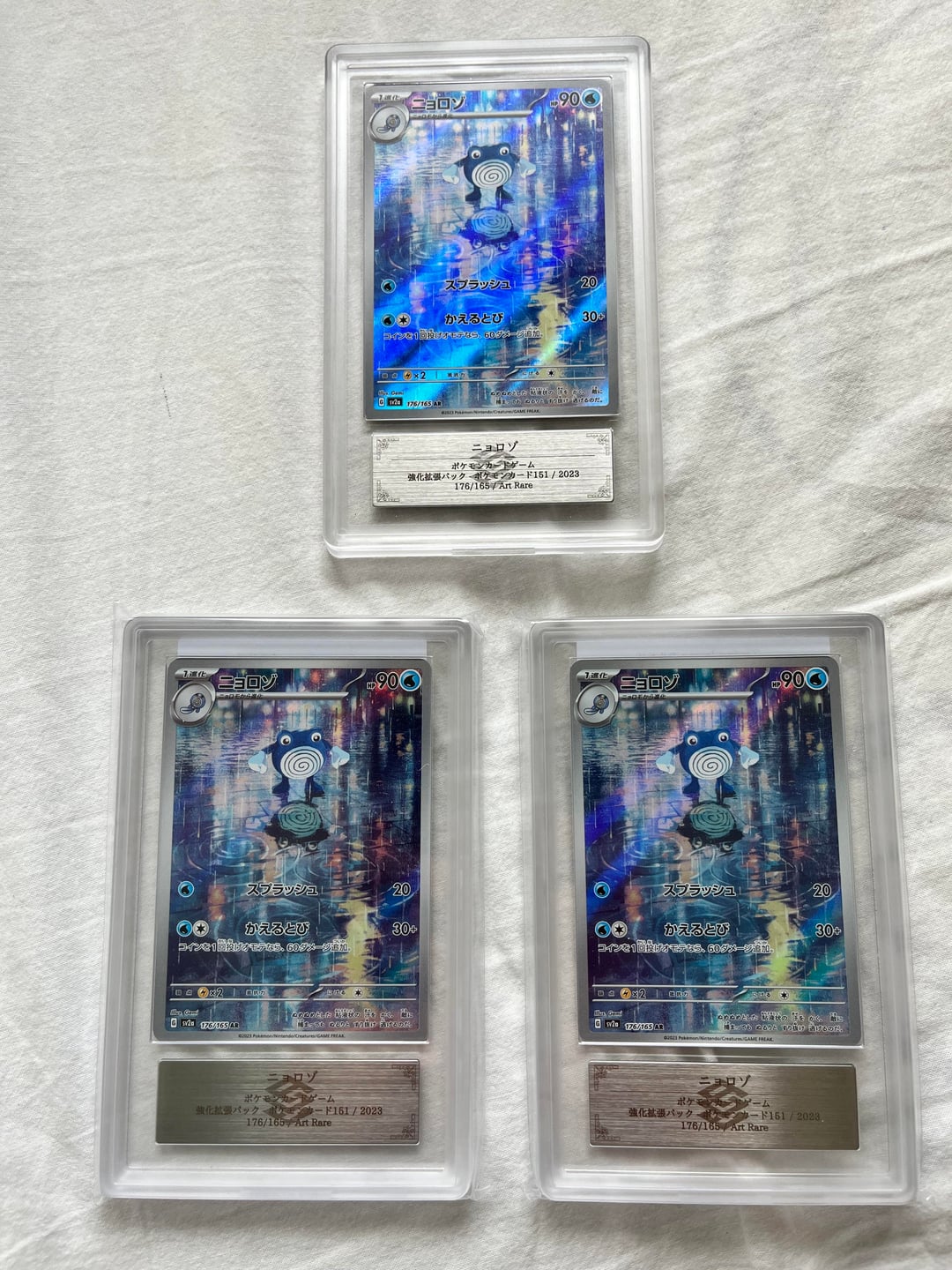 last year I bought three boxes of 151 to pull the Charmander art rare. I was completely obsessed with that card, i knew i had to pull it. so you can imagine my utter devastation when the Charmander was not in any of those boxes. as i lay on the ground, empty wrappers all around me, feeling absolutely gutted. I got an unexpected consolation prize. I pulled the poliwhirl art rare out of each of those three boxes. I don’t know if it was some cosmic sign, but it felt like the universe was telling me this is your card, this is the one meant to have. looking back, i can honestly say now i’m glad it worked out the way that it did. poliwhirl is such a quirky, funny pokemon that i never appreciated before but i do now. i love these poliwhirl brothers, they are the trio that I didn’t know I needed 😂
