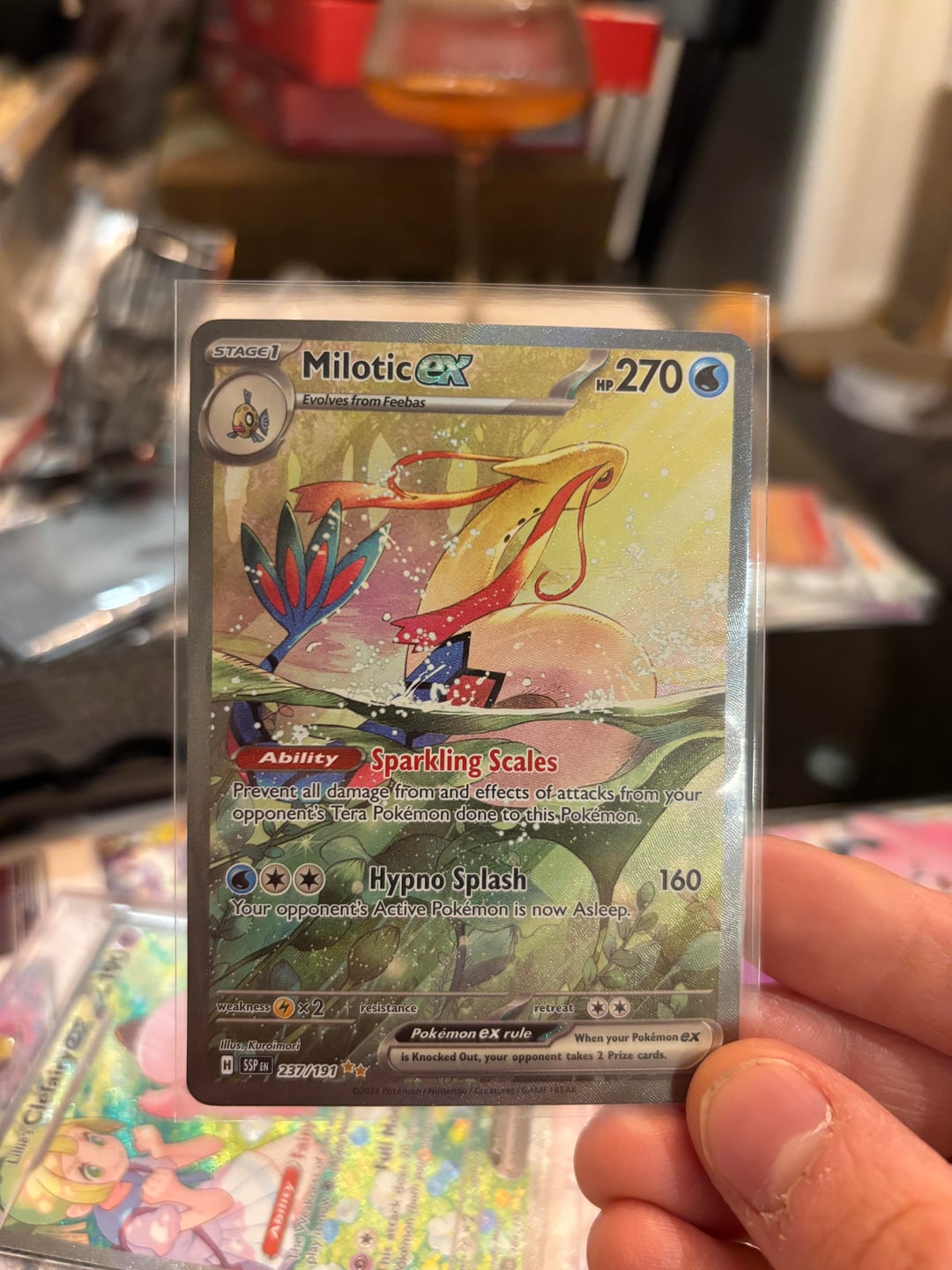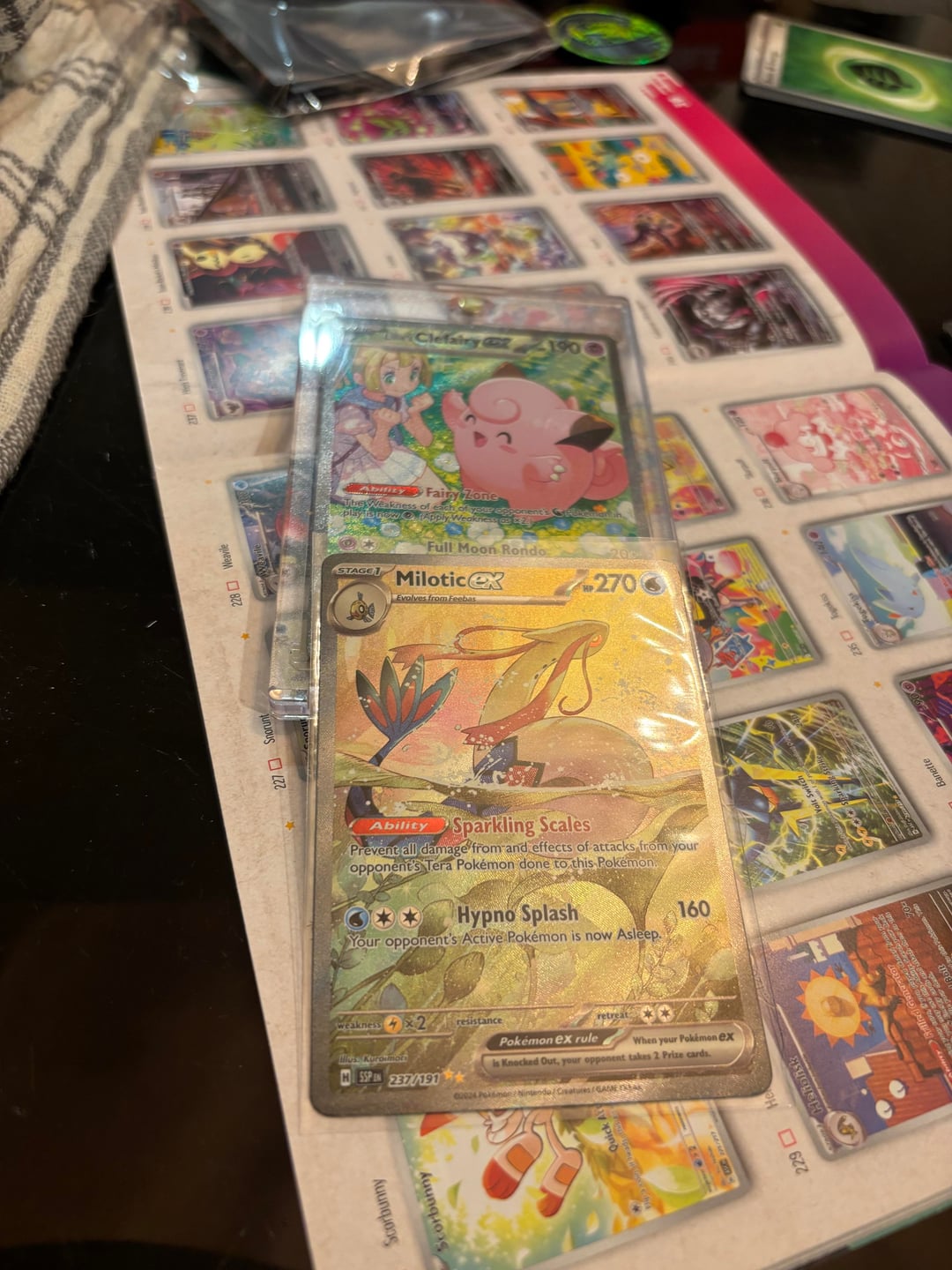 Later last night she’s sorting her binder and has an urge to rip more. I pull the last Surging booster bundle off my shelf, somehow the Milotic is in the very first pack she opens.