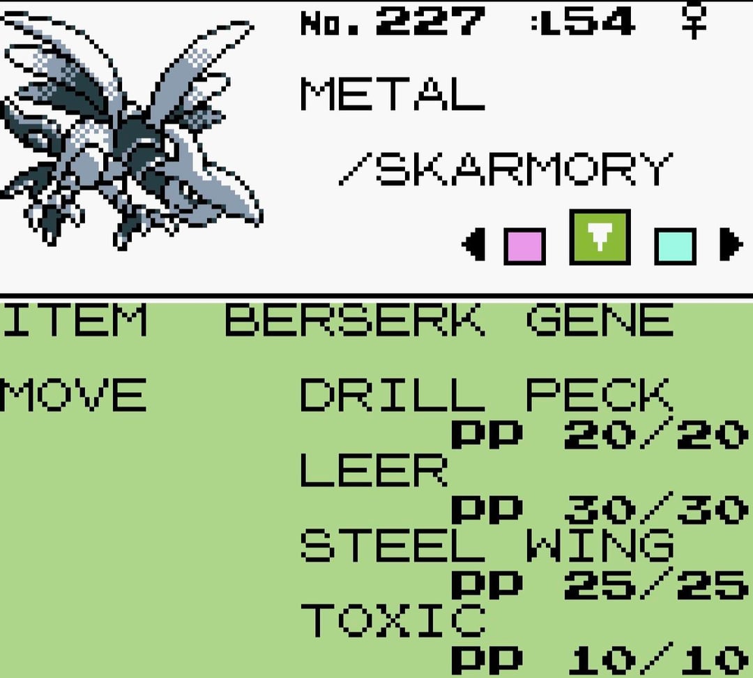 Started as a nuzlocke, but *queue “Because I Got High” by Afroman* it ended up as a run using only single evo Pokemon introduced in gen 2. Trying to now turn it into a somewhat viable team to use to go through Pokemon Stadium 2, which is why I have the Bezerke Gene on Metal. Anyone try a similar run with different mons?
