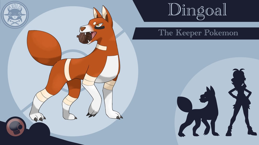 Dingoal is fueled by a fighting spirit. People and pokemon gather to watch packs of Dingoal play their games to decide which one gets to eat first. Any Dingoal that underperforms will be ousted from the pack. Their ball is made out of twigs and leaves, fashioned by Alkari (a monkey pokemon).