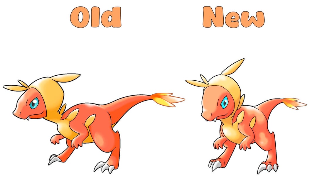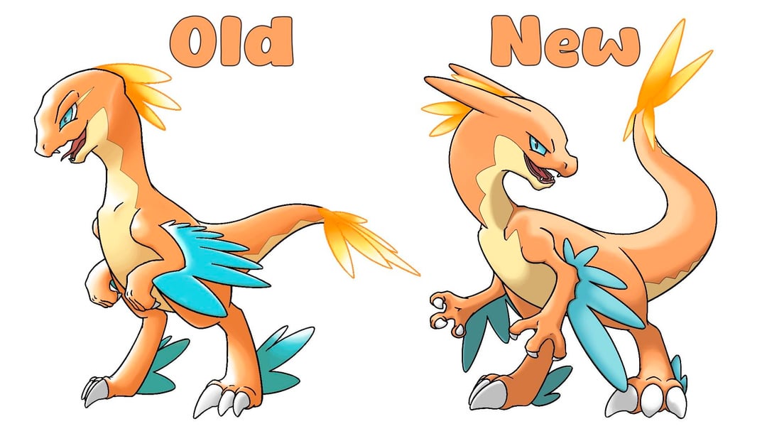 This is the Fire Starter evolution line for my Jurassic-franchise-inspired Pokemon Region. It is a combination of a Paradox, a Prehistoric and a Convergent Charmander, Charmeleon and a Charizard.