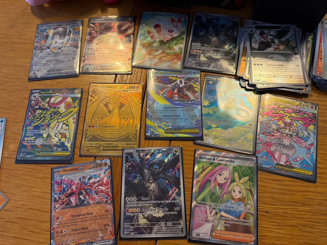 As the title says, a few days ago my 4 year old daughter pulled a gold Mega Charizard X EX from a Phantasmal Flames ETB, and this afternoon she pulled a gold Mega Charizard Y EX from one of the two Ascended Heroes ETBs I managed to pick up on release day!