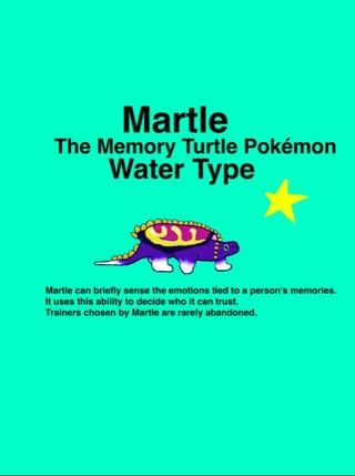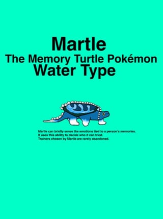 Pokédex: “Martle can briefly sense the emotions tied to a person's memories. It uses this ability to decide who it can trust.Trainers chosen by Martle are rarely abandoned.”