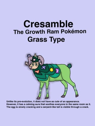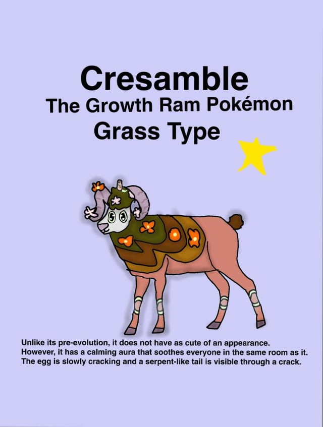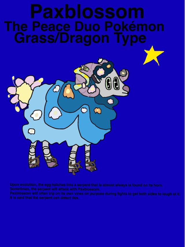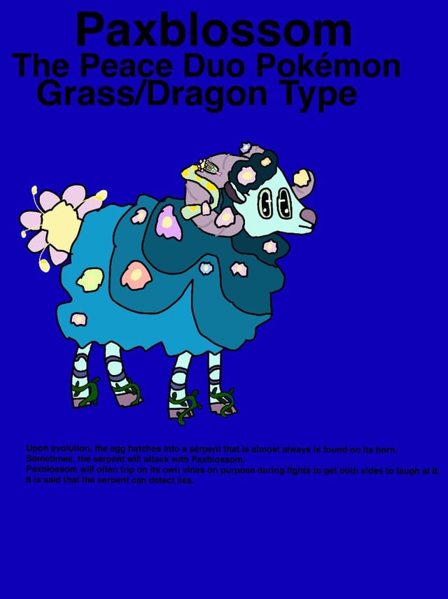 Pokédex: “Upon evolution, the egg hatches into a serpent that is almost always is found on its horn. Sometimes, the serpent will attack with Paxblossom. Paxblossom will often trip on its own vines on purpose during fights to get both sides to laugh at it. It is said that the serpent can detect lies.”