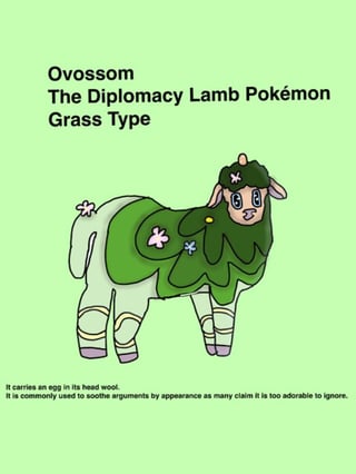 Pokédex: “It carries an egg in its head wool. It is commonly used to soothe arguments by appearance as many claim it is too adorable to ignore.”